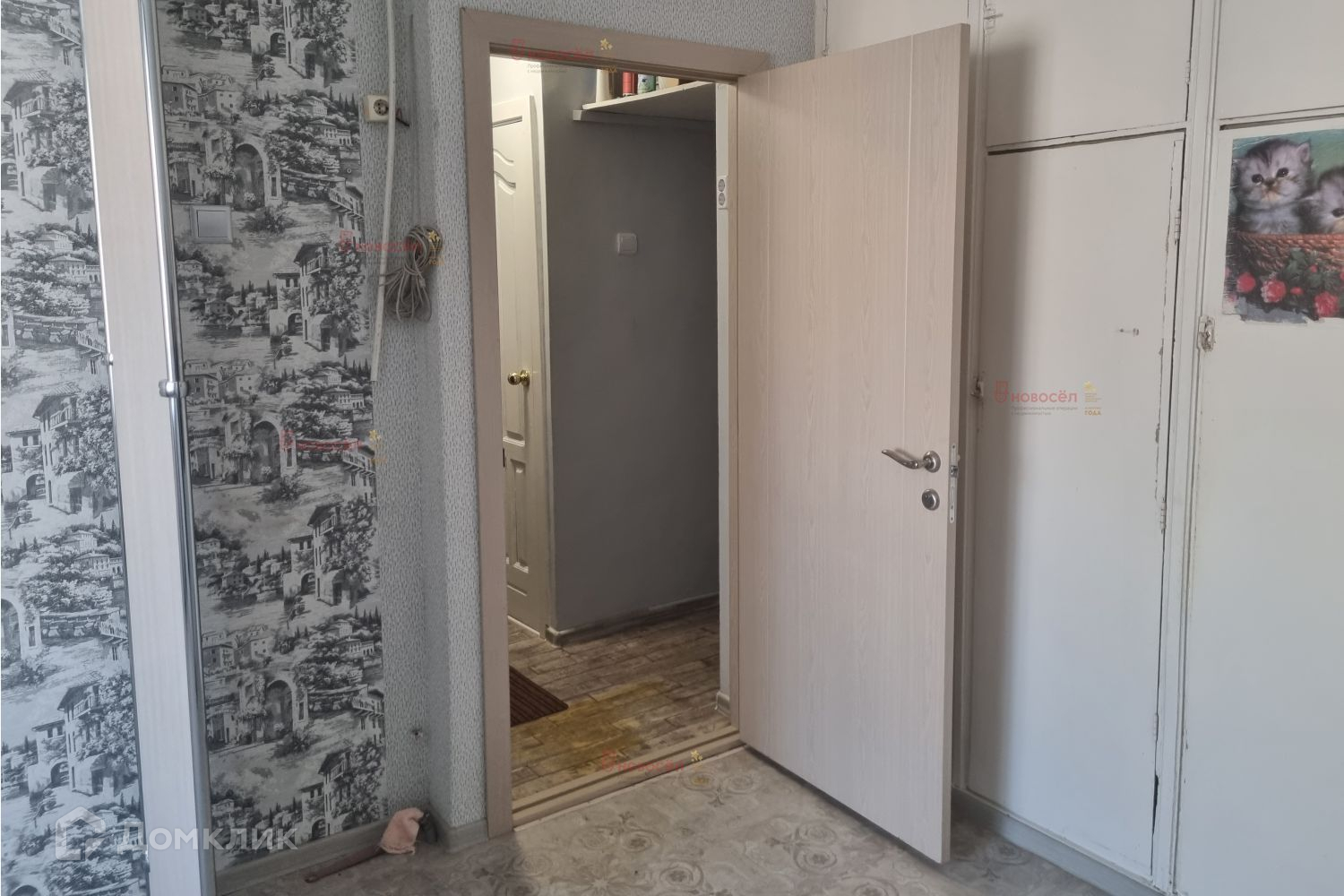 В комнате пластиковое окно, дорогая входная дверь, встроенный шкаф. Всё, что есть на фото остаётся. В комнату заведена вода для стиральной машины и также отвод воды из стиральной машины.