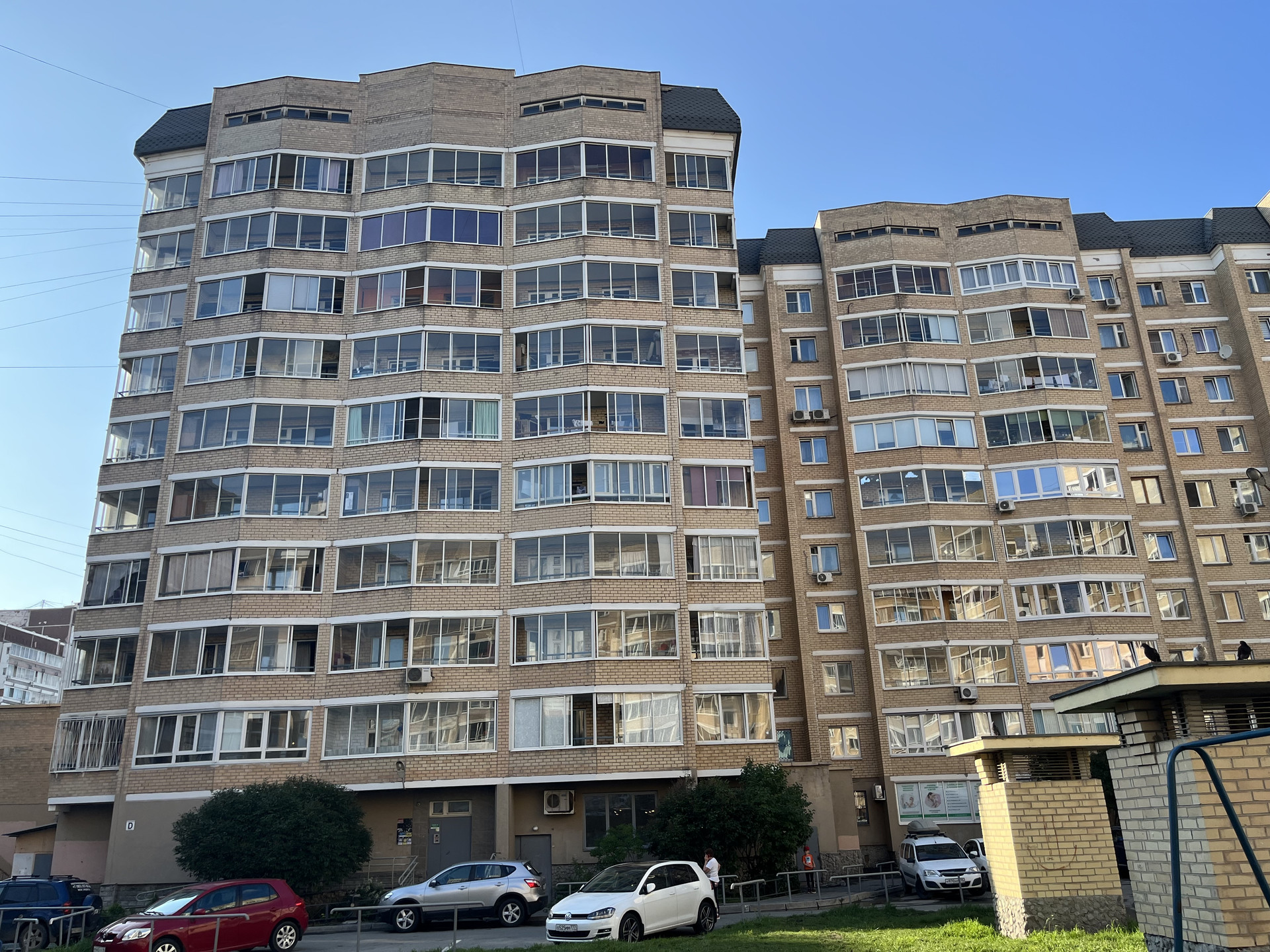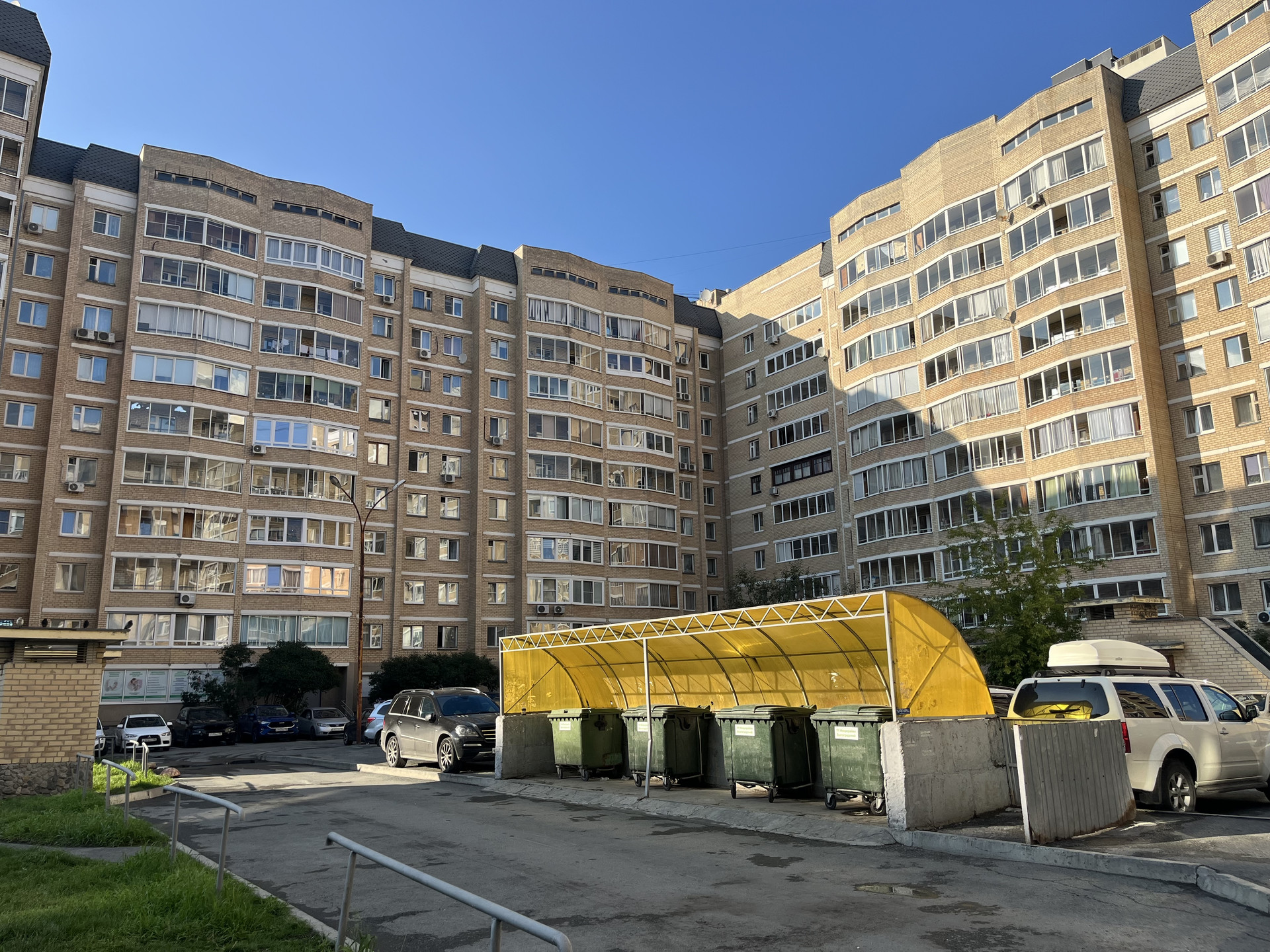 Большой закрытый двор с детской площадкой и охраняемым двором, подземная парковка под домом.