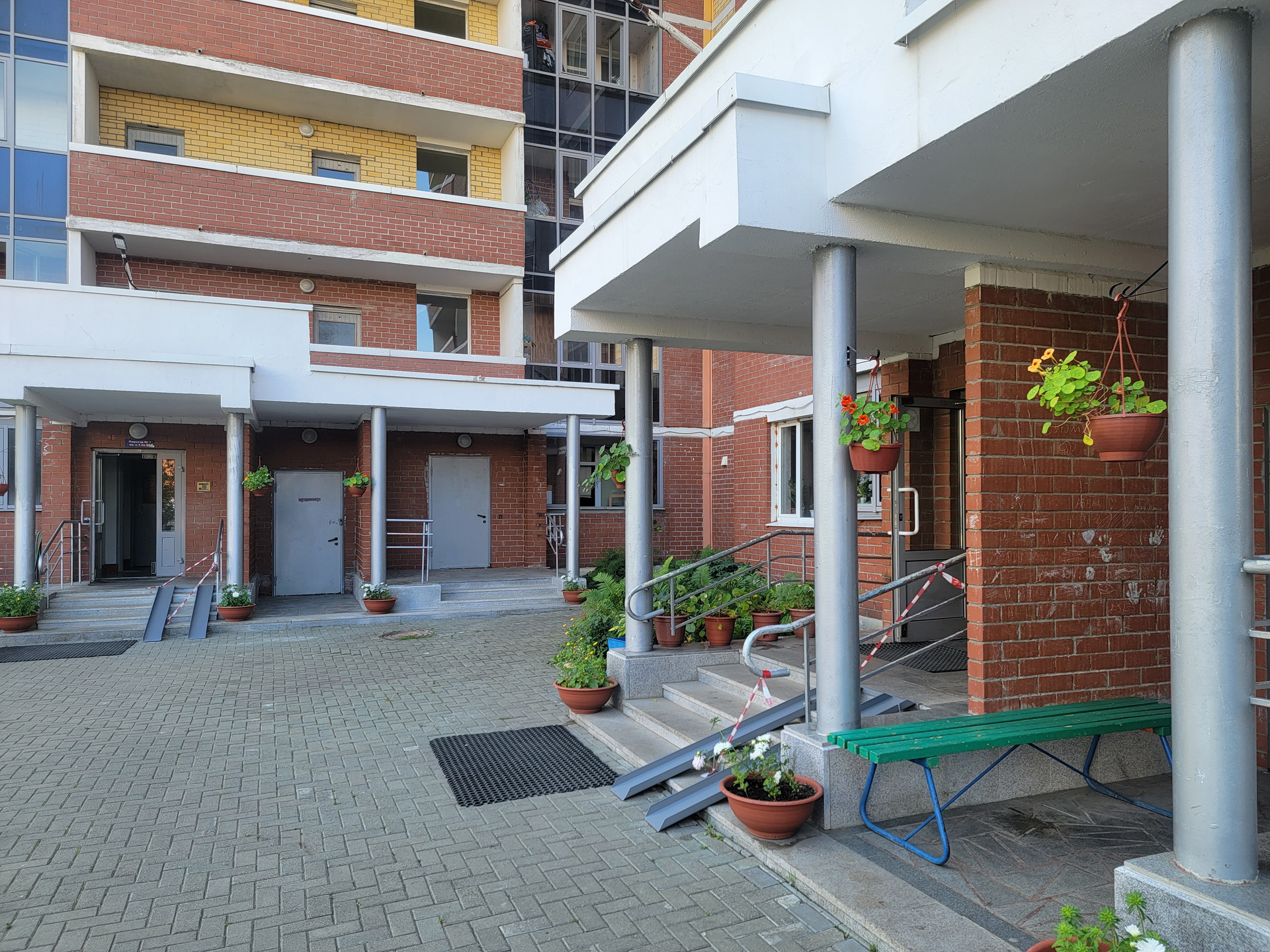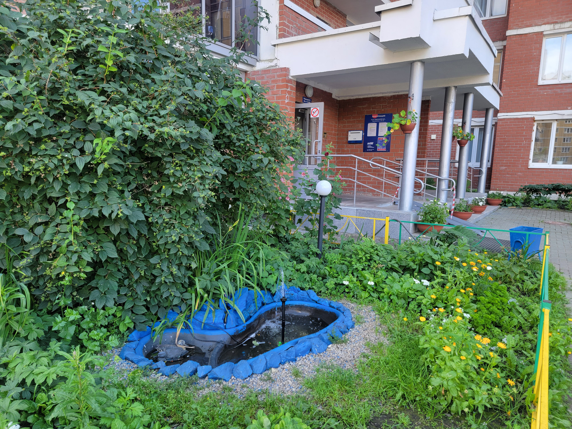 Во дворе фонтан, озеленение, корт, детская площадка.