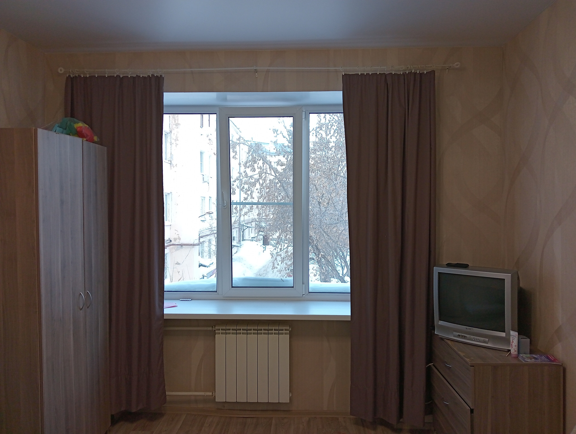 Окно комнаты выходит во двор, в первой половине дня всегда солнечно, при этом всегда тишина и отличный вид на деревья во дворе.