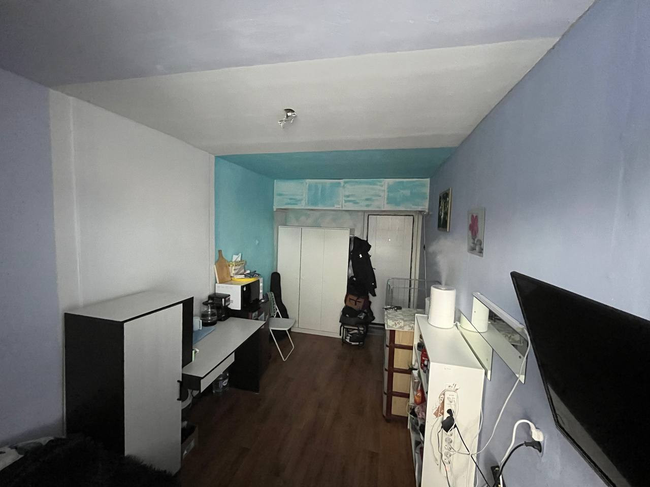 Стены откапиталены , свежий линолеум, встроенный шкаф наверху для оптимизации хранения.