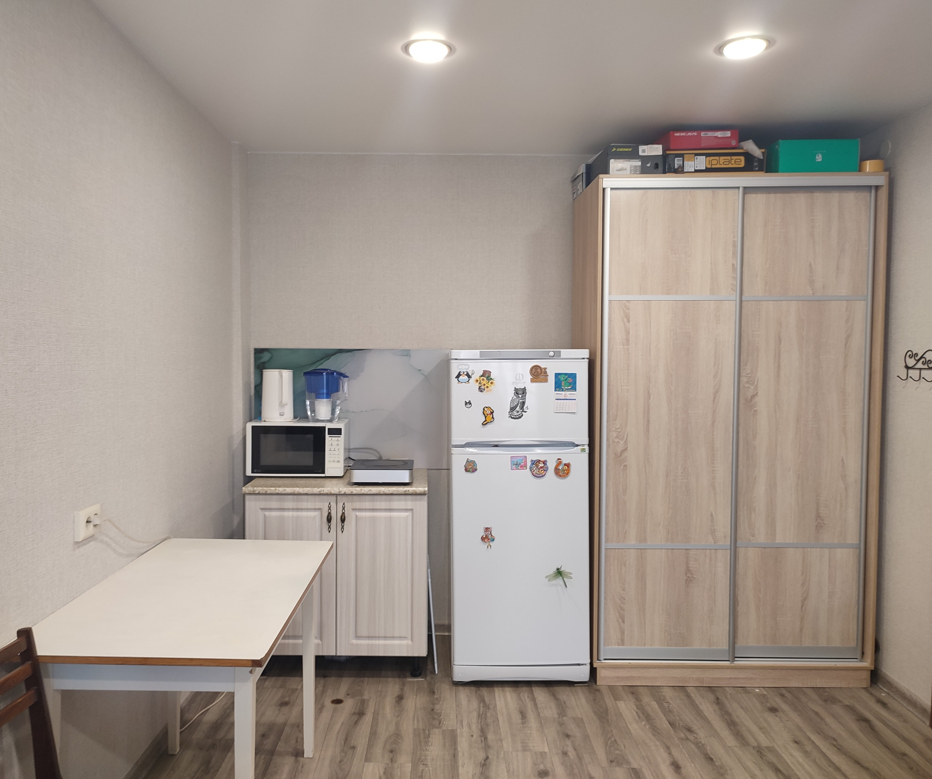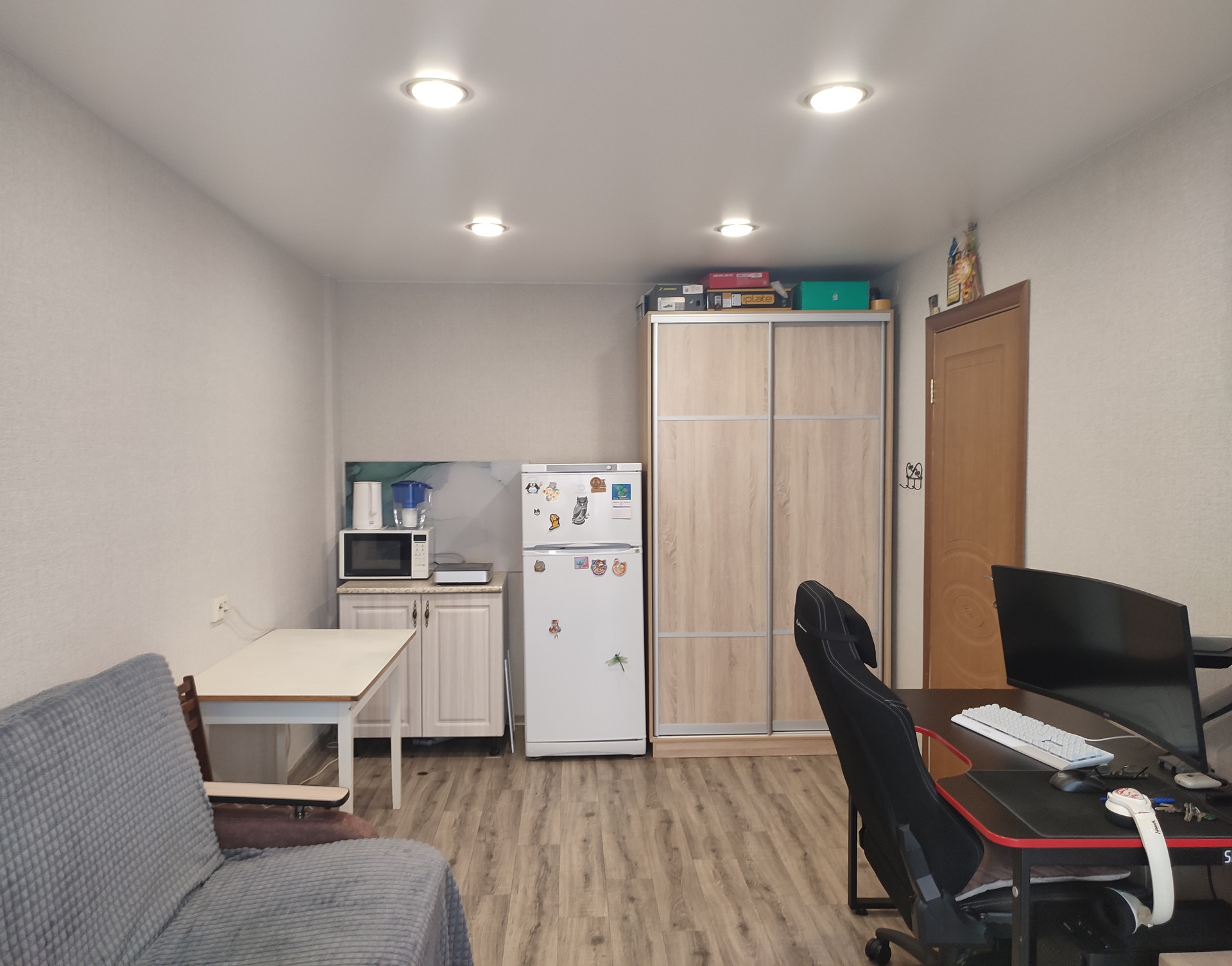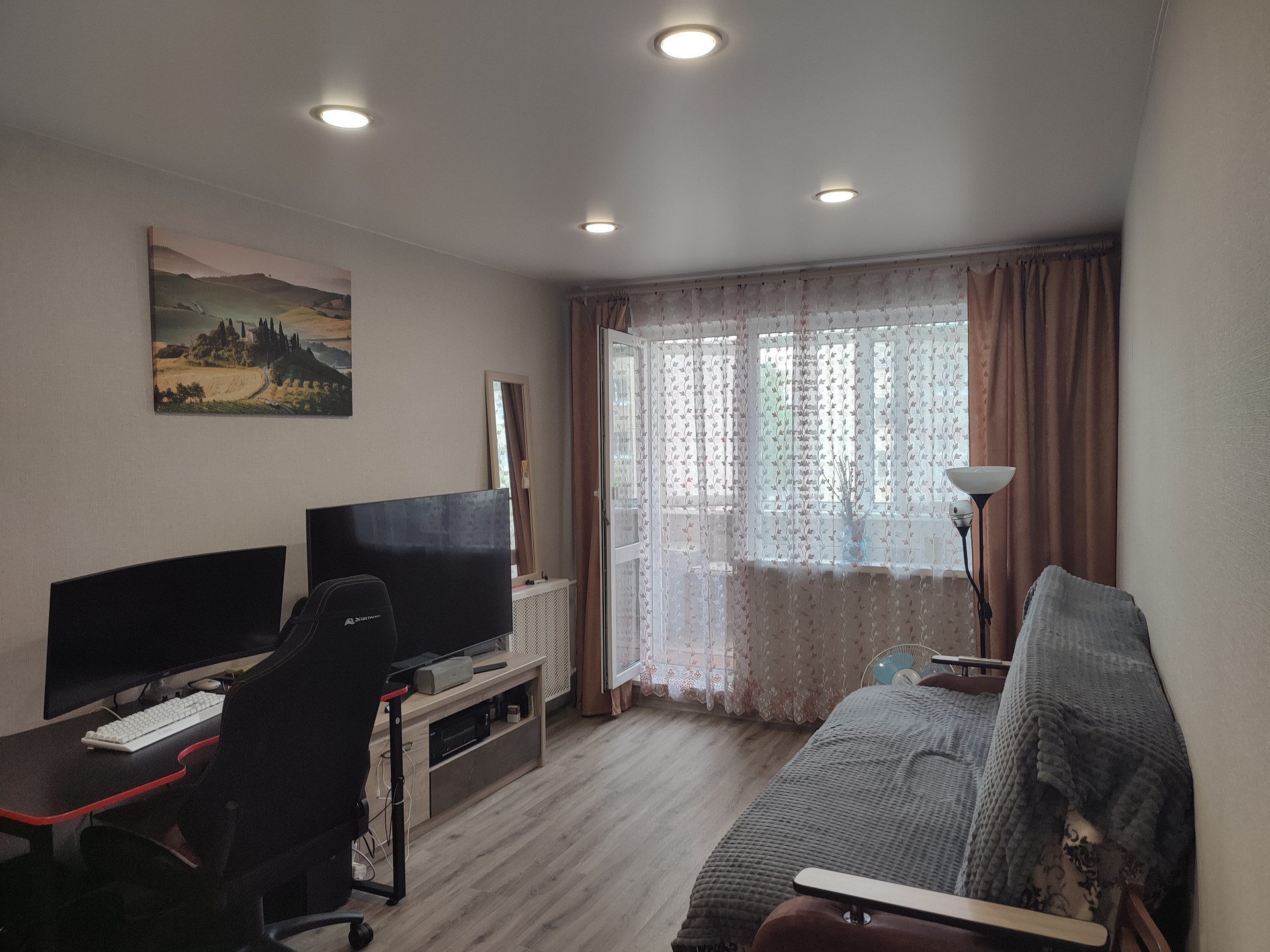 Состояние комнаты отличное: свежий ремонт, на полу ламинат, пластиковые окна, межкомнатная дверь, оборудована кухонная зона , хорошая сейф дверь. Есть свой балкон, стеклопакеты, балкон отделан пластиком.