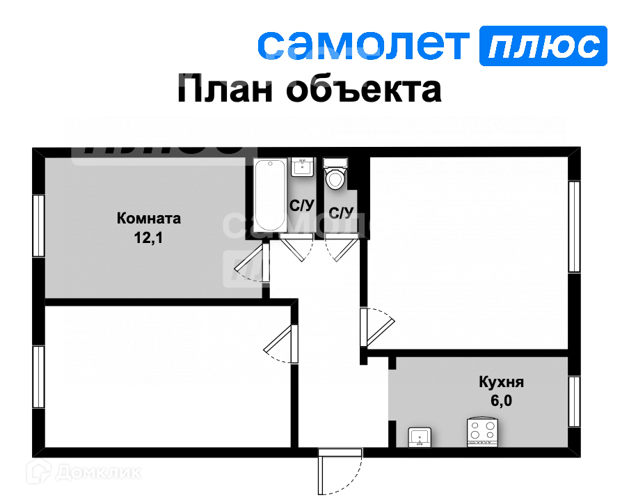 Площадь комнаты равна 12.1 м2, общая площадь квартиры составляет 54.9 м2