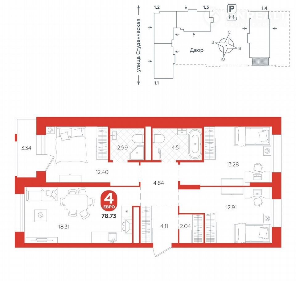 площадь квартиры - 78,73 кв.м