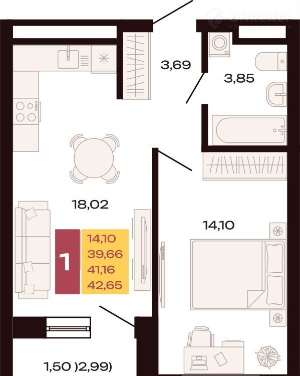 Общая площадь 42.7 м2
