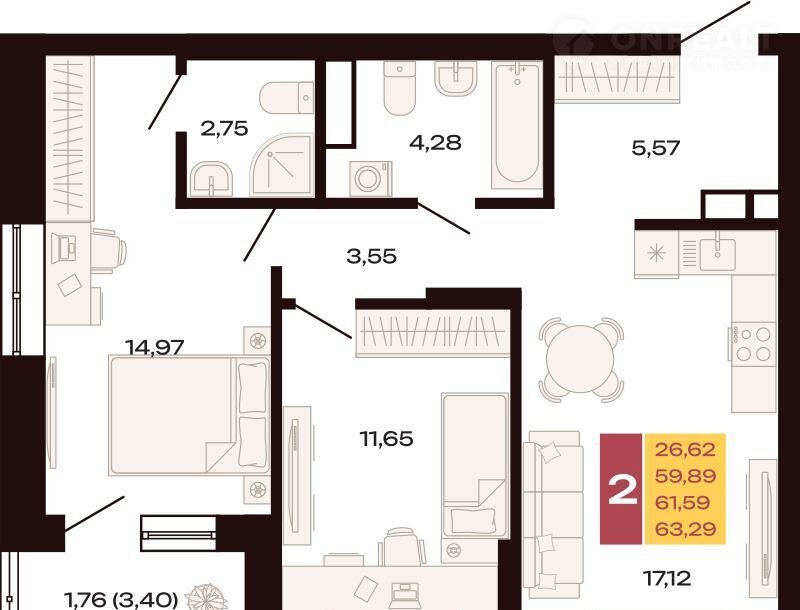 Общая площадь 63.3 м2