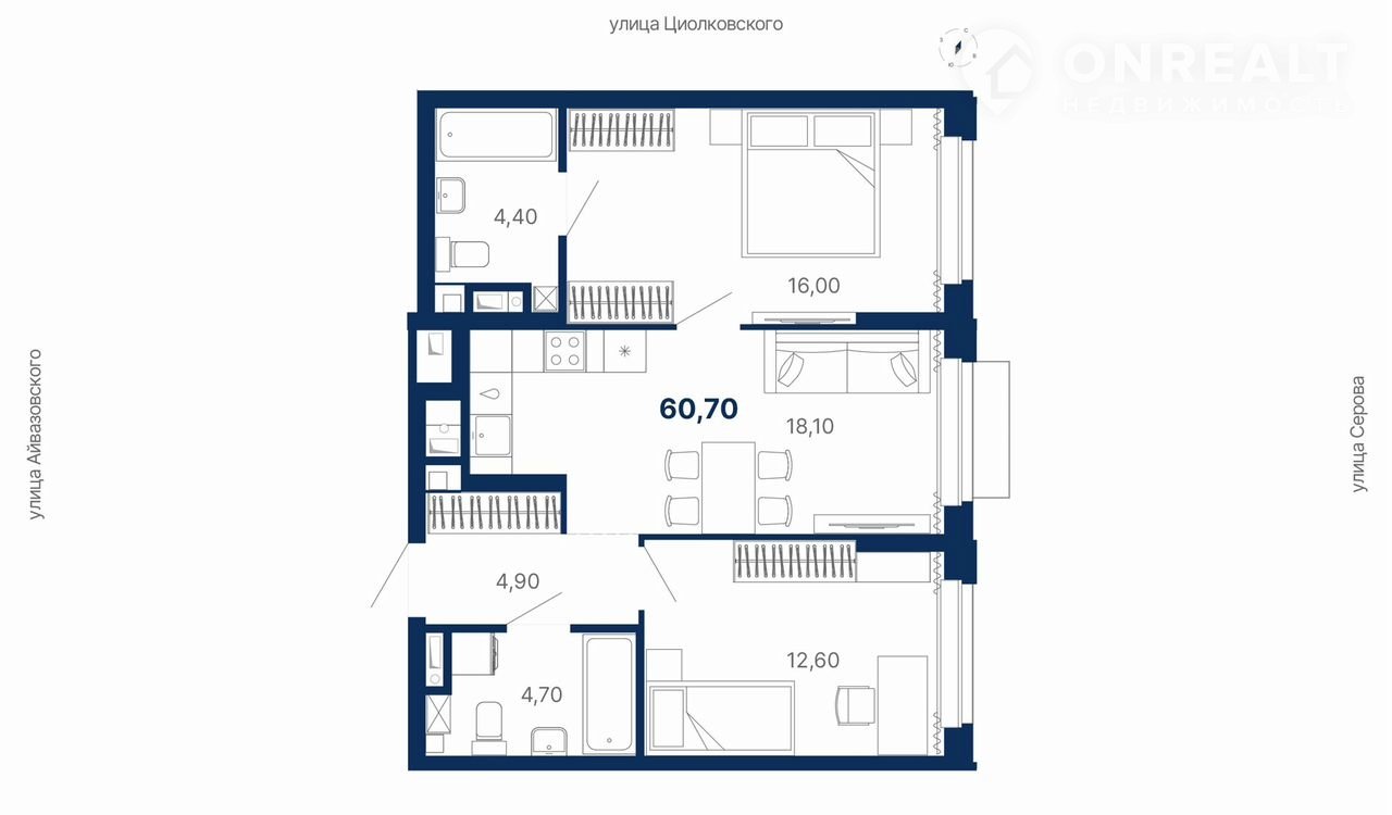 Общая площадь 60.7 м2