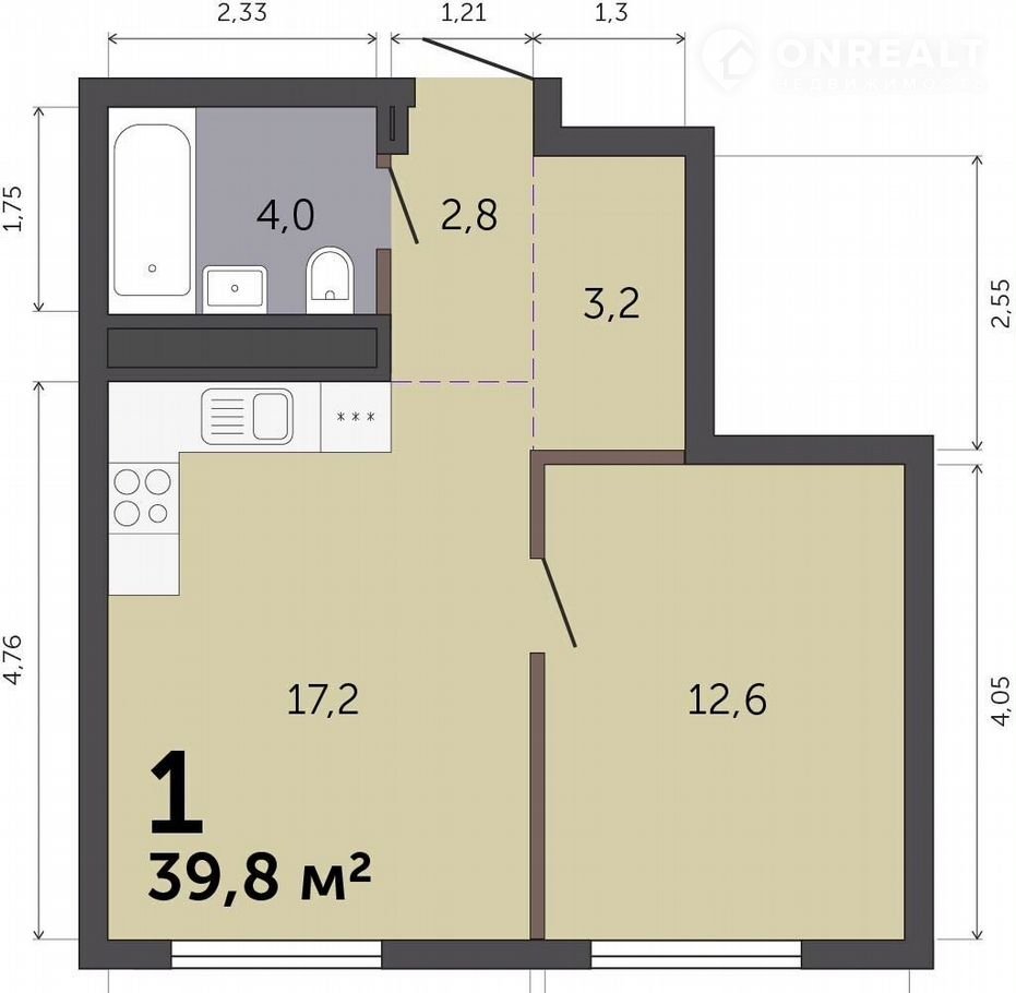 Общая площадь 39.8 м2