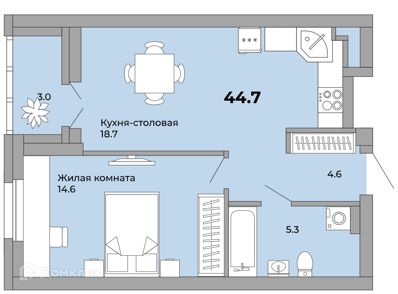 Общая площадь 44.7 м2