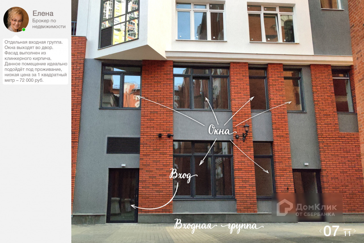 Отдельная входная группа. Окна выходят во двор. Фасад выполнен из клинкерного кирпича. Данное помещение идеально подойдёт под проживания, низкая цена за 1 квадратный метр – 75 000 руб.