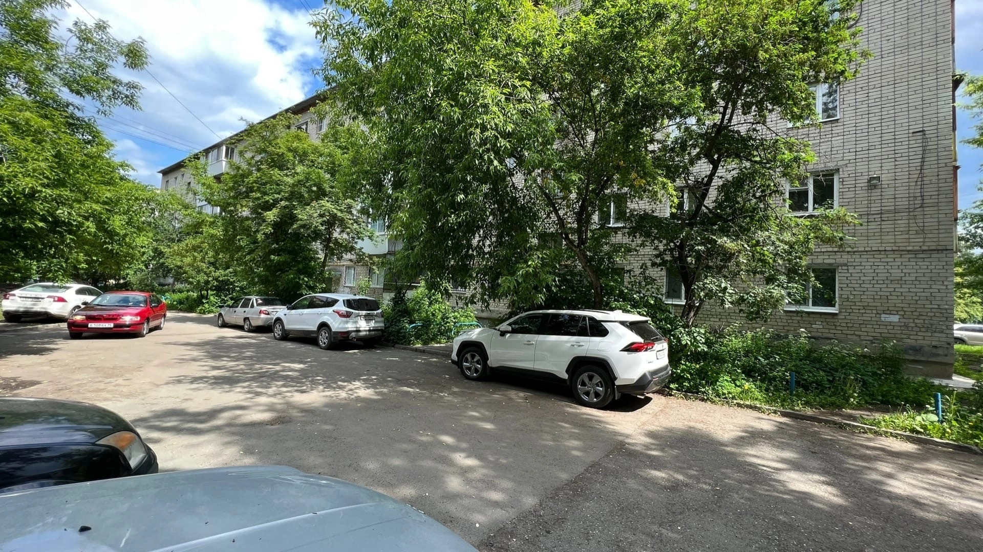 Во дворе большая детская площадка, корт, много зелени.