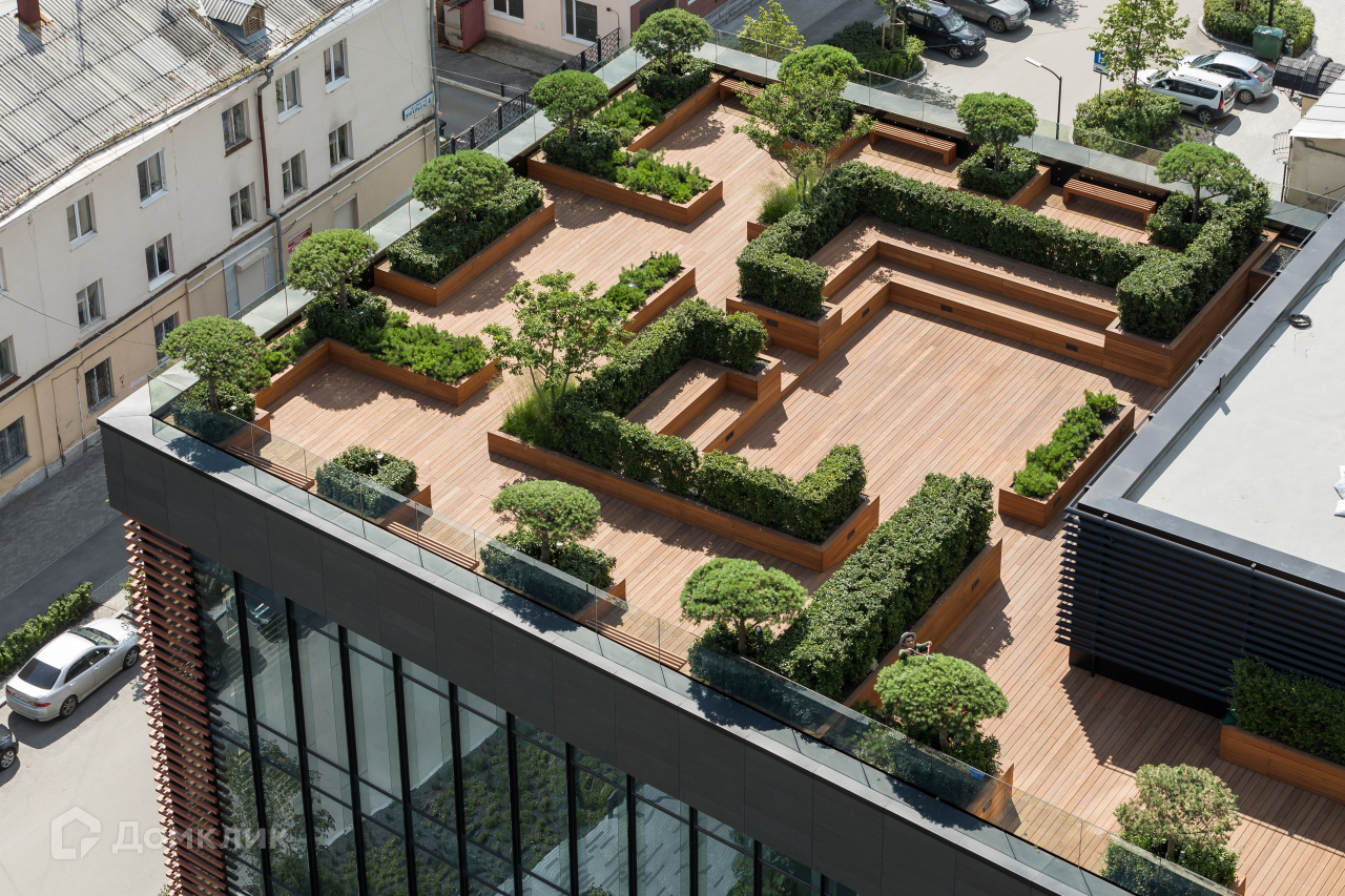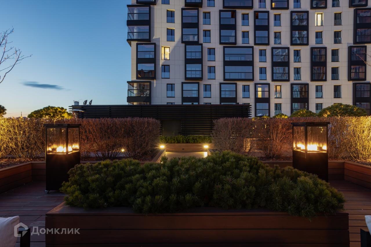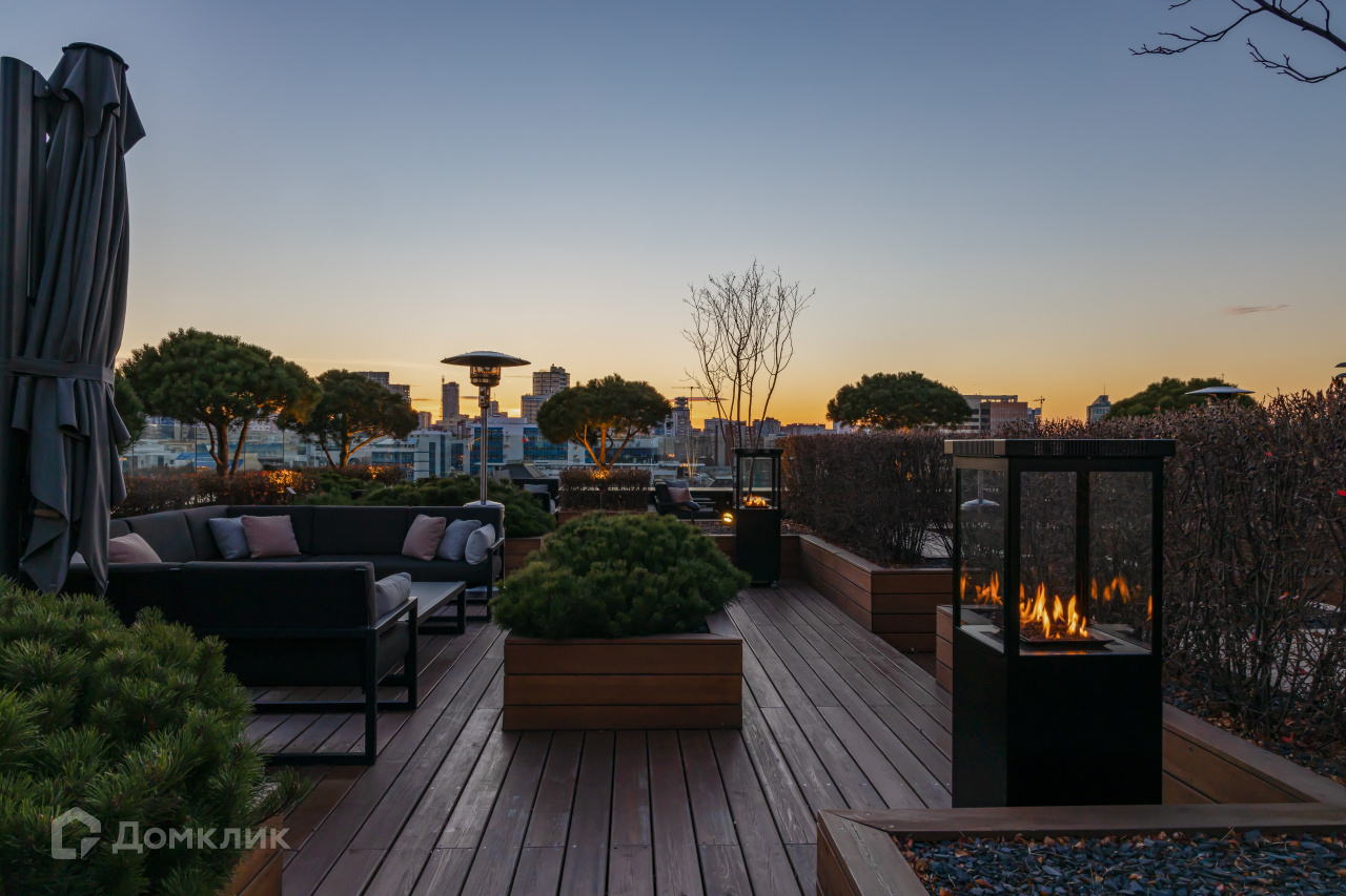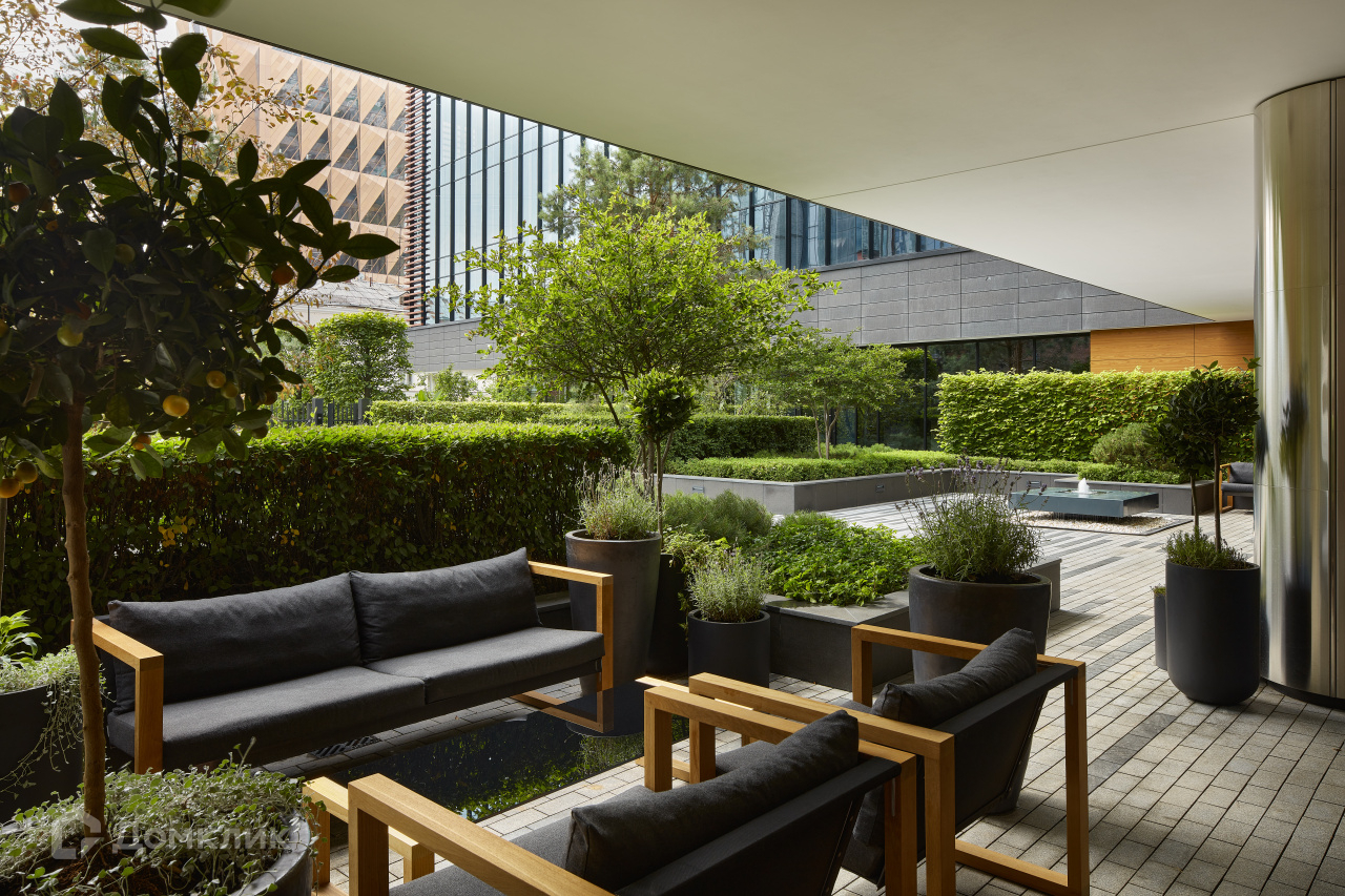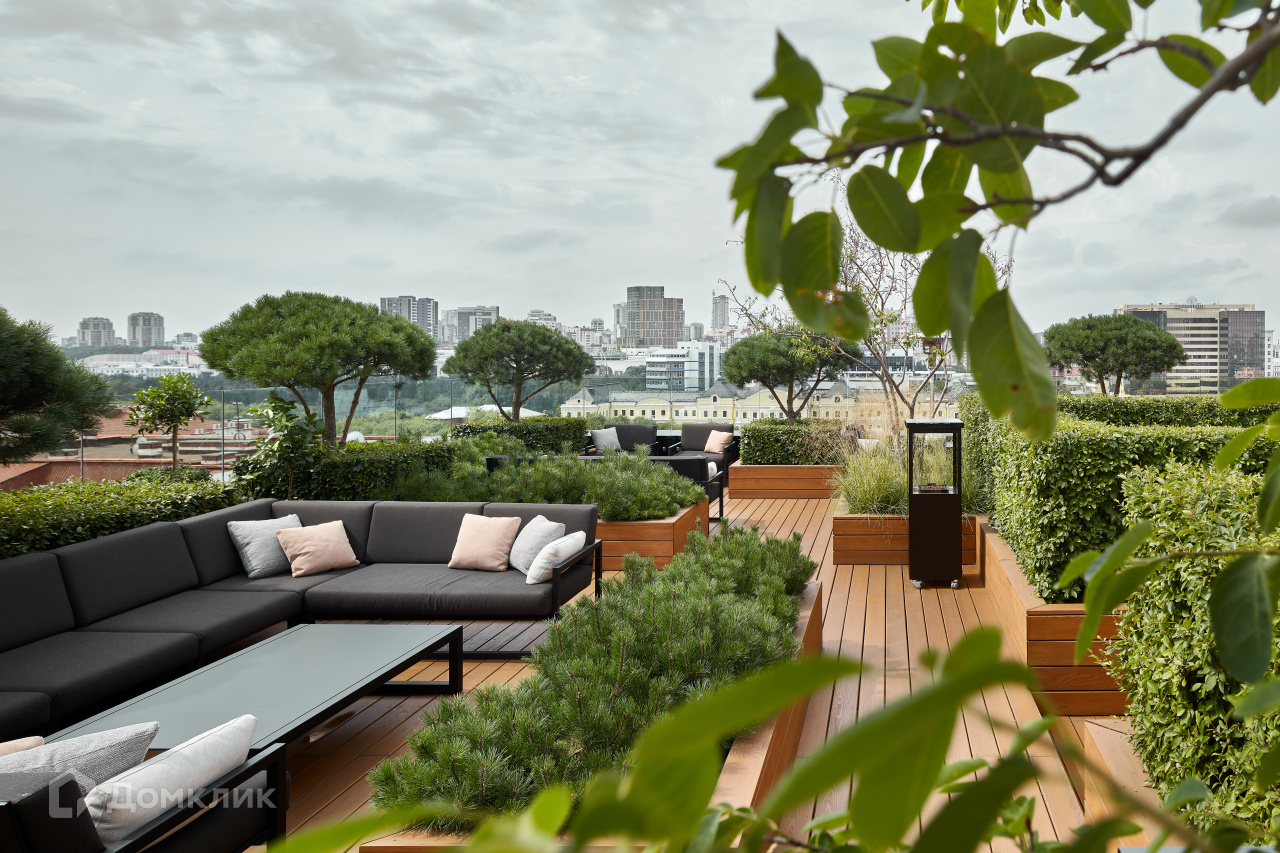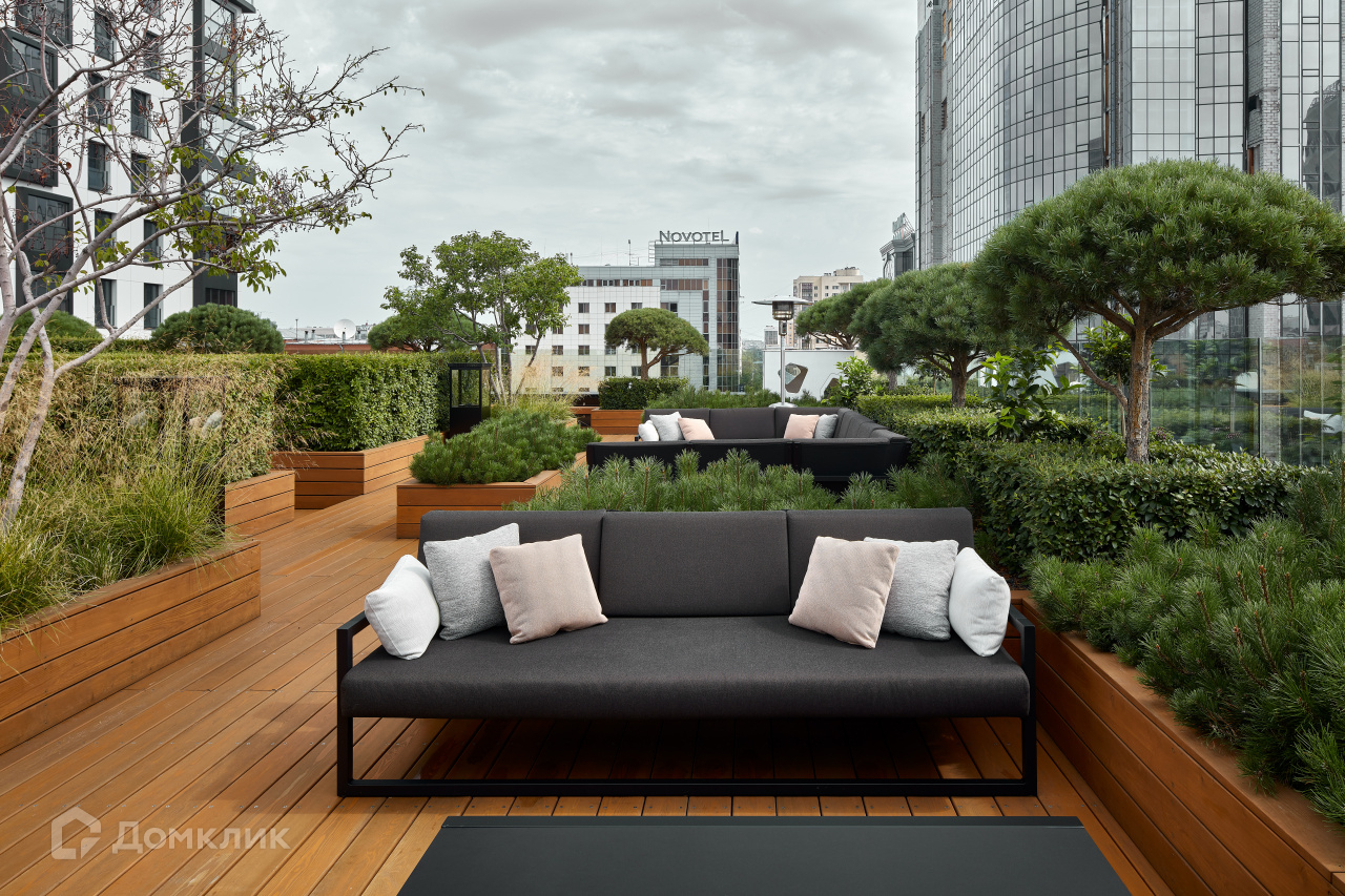 На седьмом этаже для жителей «Кандинского» организована просторная терраса.Здесь высажены сосны и канадская ирга, установлена мебель — мягкие диваны и столики, за которыми можно пить чай или работать. В холодное время года на террасе включают обогреватели.