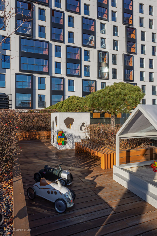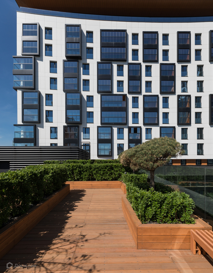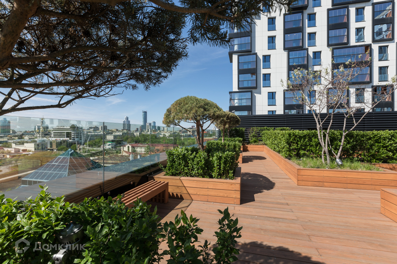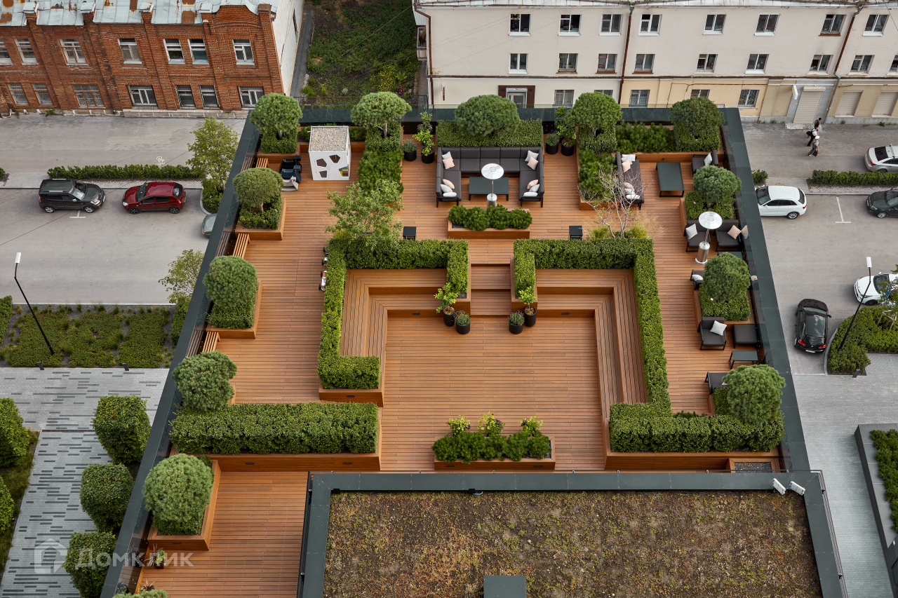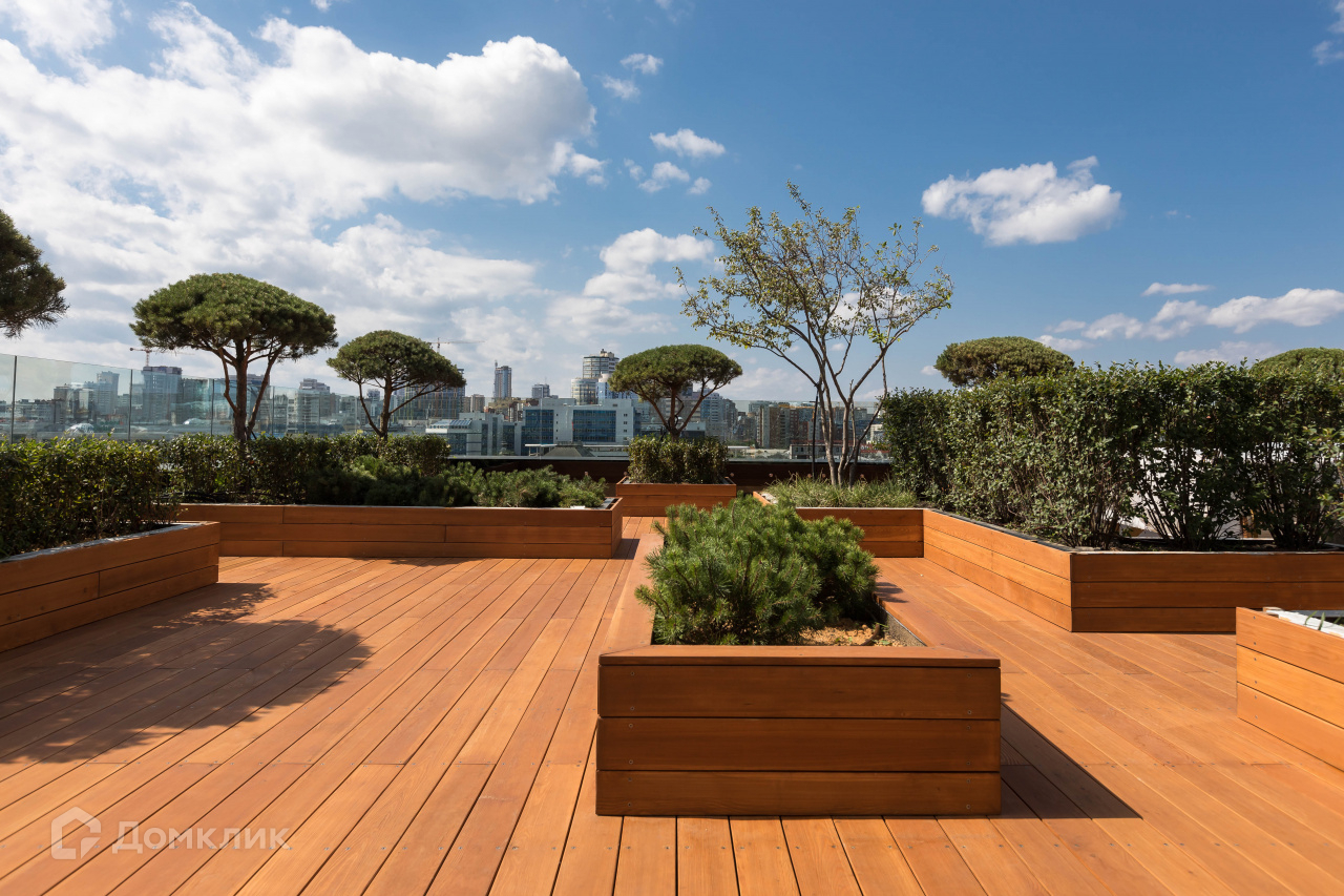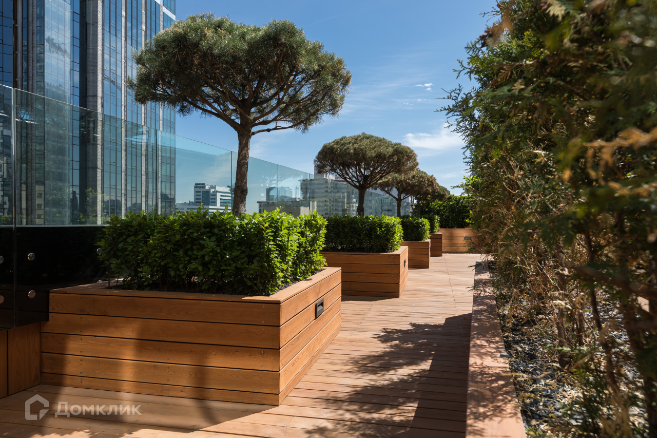 На седьмом этаже для жителей «Кандинского» организована просторная терраса.Здесь высажены сосны и канадская ирга, установлена мебель — мягкие диваны и столики, за которыми можно пить чай или работать. В холодное время года на террасе включают обогреватели.