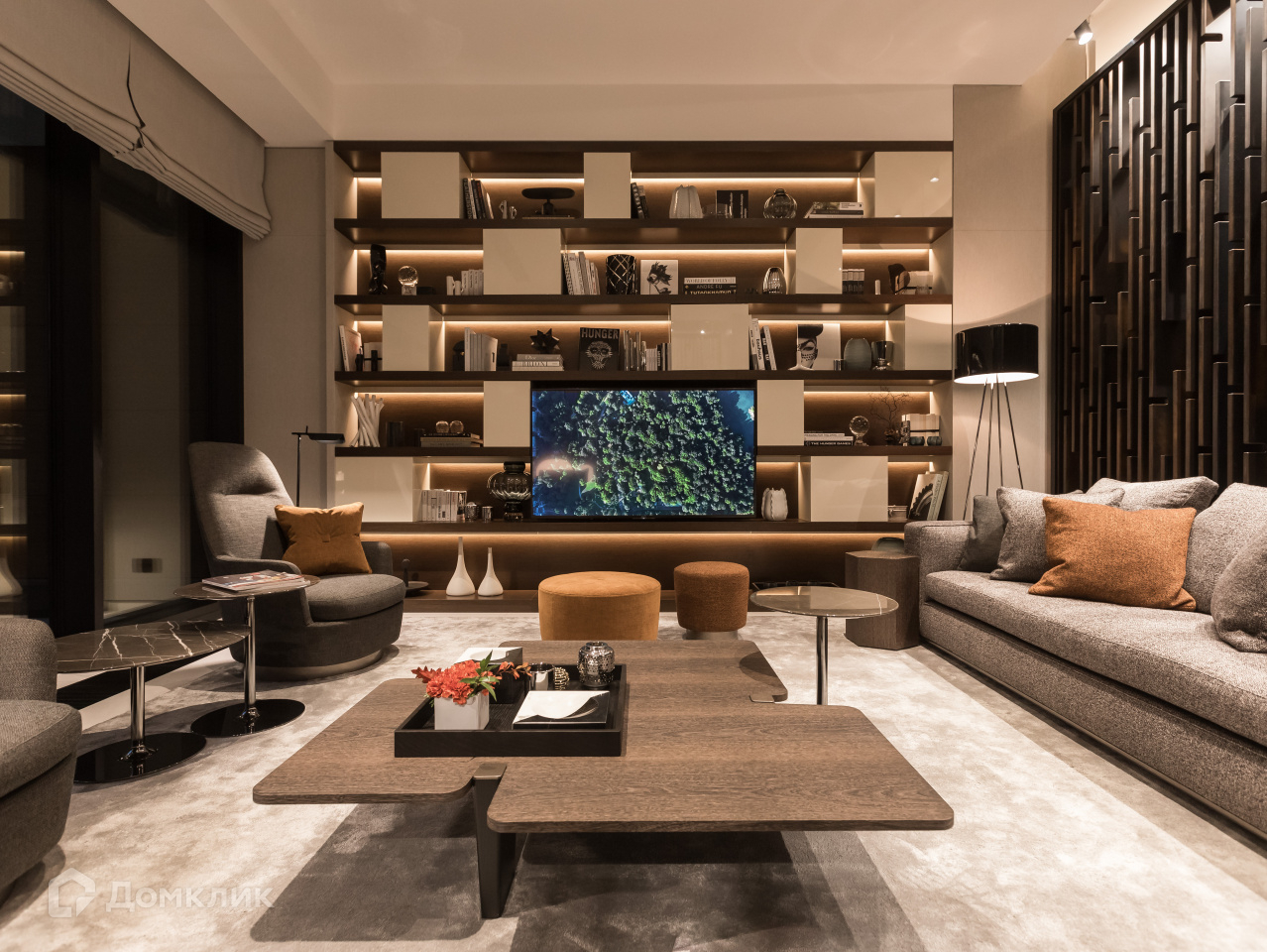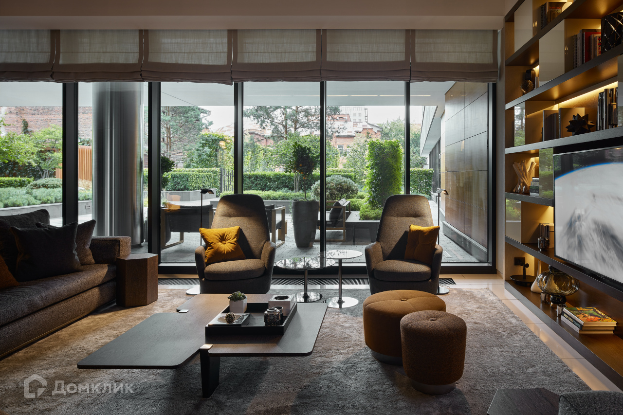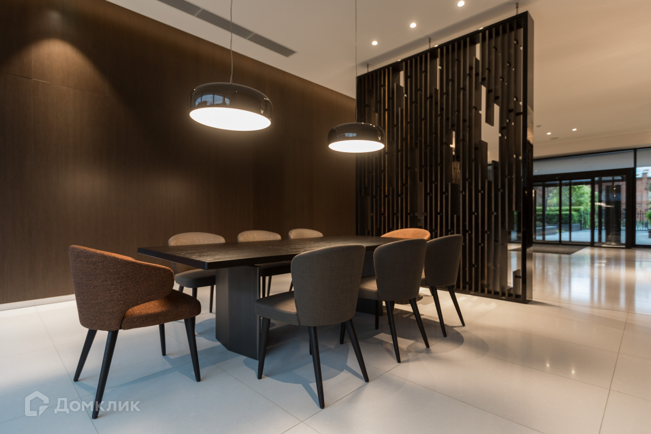 За счет многоуровневого освещения тёплых оттенков, мягких ковров и декоративных элементов: зеркал, картин, дивайдера, — пространство этажа воспринимается как продолжение квартиры.На первом этаже расположены две уютные гостиные, место для переговоров и зона для приготовления кофе или чая.