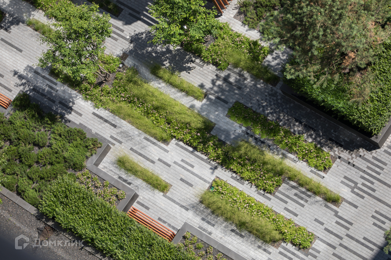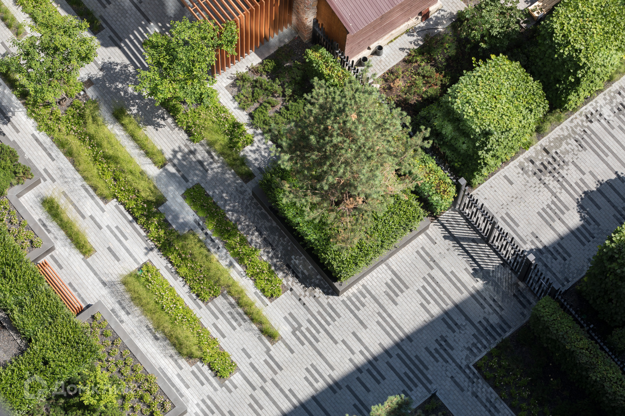 Во дворе высажены деревья — канадская ирга, сосна, яблони, липы, туи, кустарники — горная сосна, кизильник, спирея, роза, виноград, осока морроу и гортензии. Всего более 25 видов растений, чтобы двор выглядел разнообразным и в каждое время года имел свой цвет.