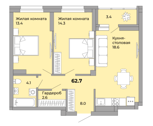 Общая площадь 62.7 м2