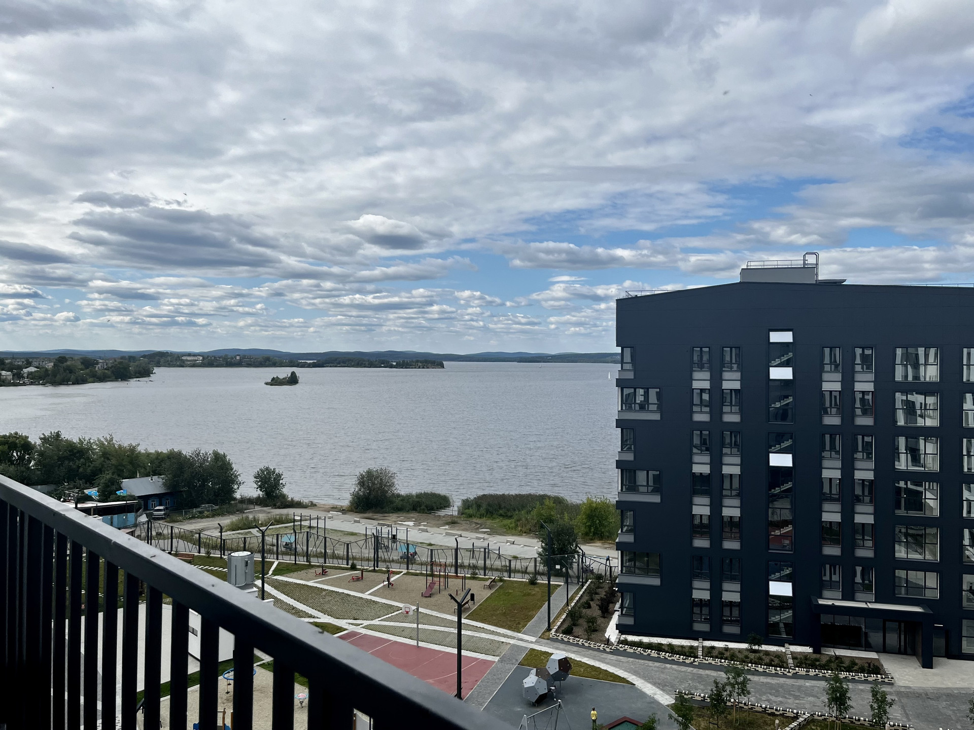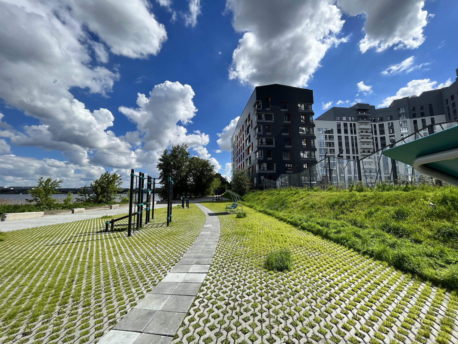 Большой закрытий двор без машин с пешеходными и велосипедными дорожками, велопарковкой, местами для отдыха и занятий спортом, детскими игровыми комплексами, выполненными из экологичных материалов, рассчитанными на разные возрастные группы. Пространство для игр покрыто песком и полимерным покрытием для предупреждения травм при падении детей. Разработан ландшафтный дизайн и многоуровневая подсветка двора. Кроме того, на набережной есть дополнительная зона для занятий спортом.