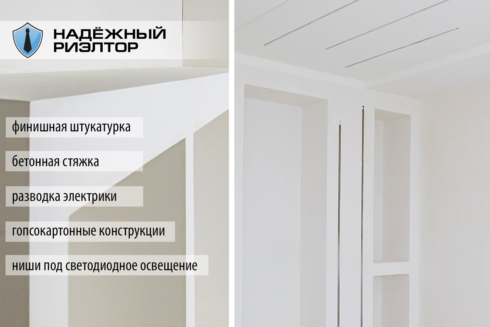 Выполнена качественная подготовка под финишную отделку, произведены работы по возведению гипсокартонных конструкций, а также ниш под светодиодное освещение. Полностью сделана разводка электрики по проекту освещения и электроснабжения, в том числе для установки кухонного гарнитура с разводкой под всю бытовую технику.