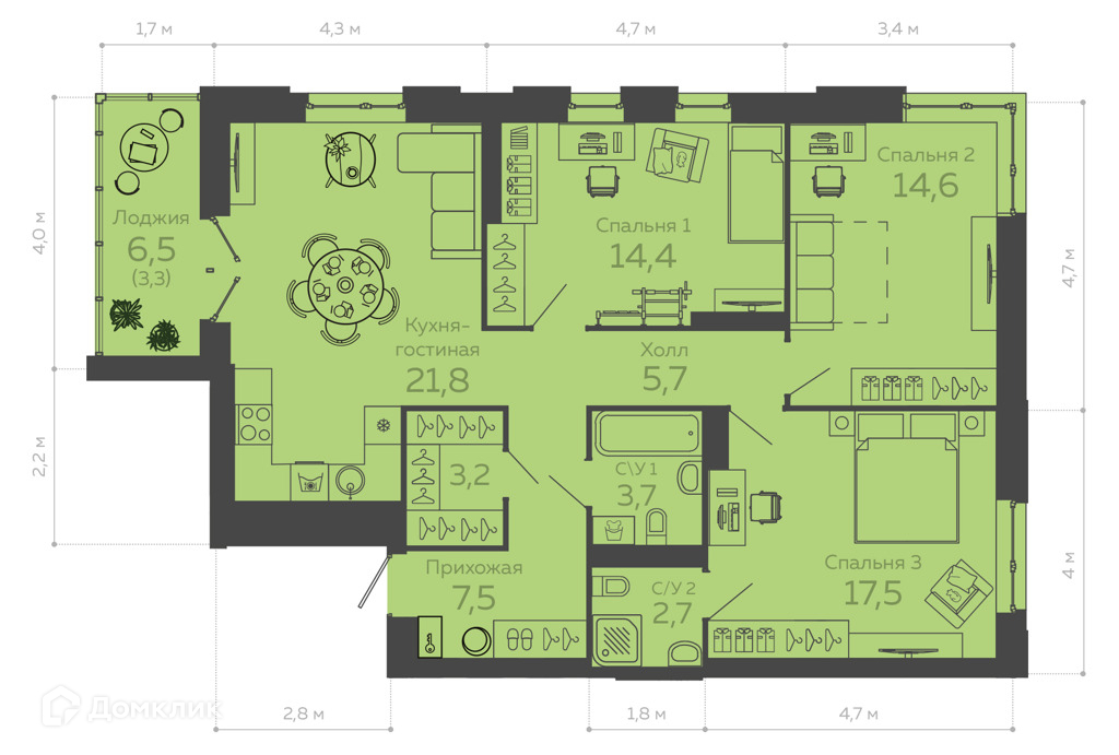 Общая площадь 94.3 м2