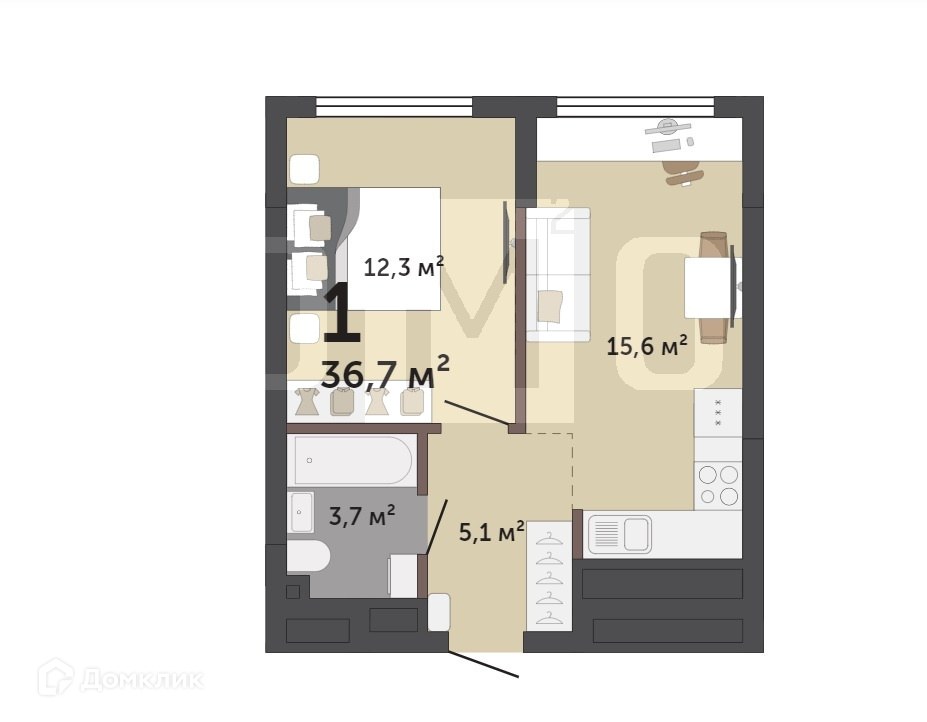 Общая площадь 34.9 м2