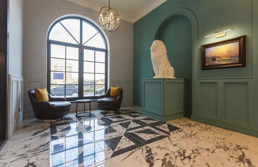 В холле расположены зона ожидания, колясочная и гостевой санузел. В холле работает сотрудник управляющей компании, который следит за порядком, встречает гостей, принимает заявки от жителей. Первый этаж, двор и лифты находятся под видеонаблюдением. Интерьер жилых этажей оформлен в классическом стиле, как и холл дома. Закрытый двор.