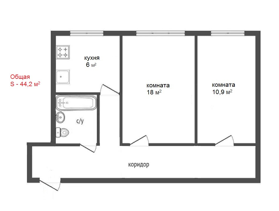 Общая площадь 44.2 м2