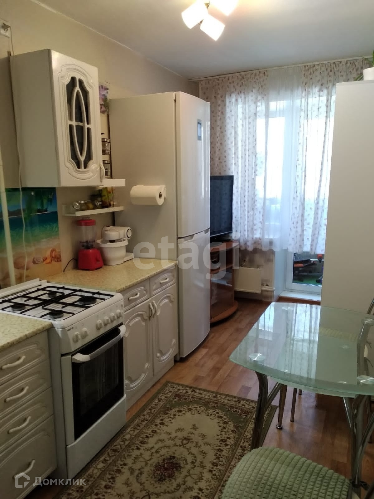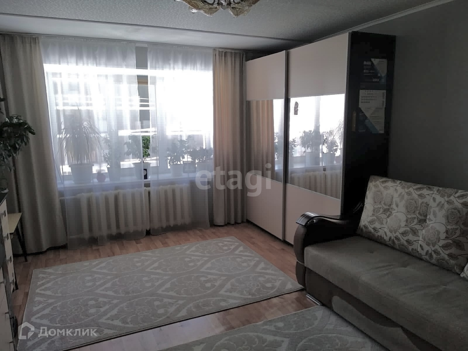 При продаже остается кухонный гарнитур, газовая плита, шкаф-купе, диван.