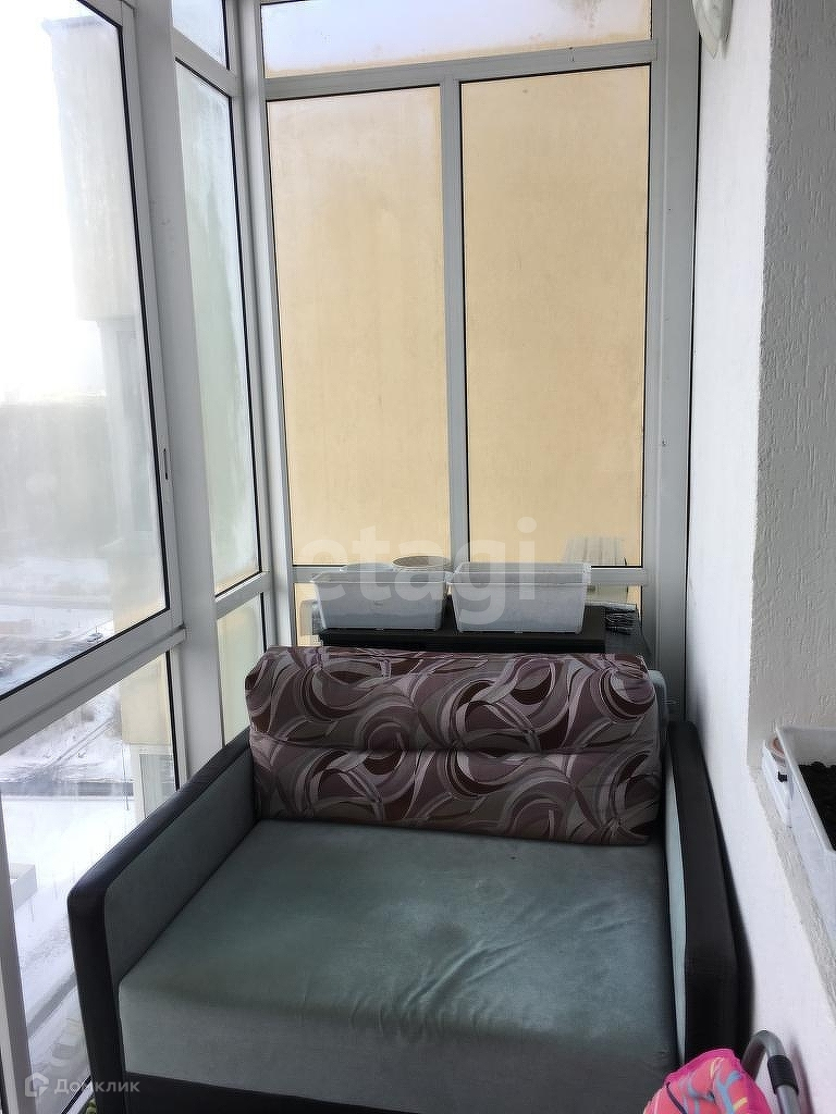 Лоджия застеклена панорамными окнами и имеет зону отдыха.