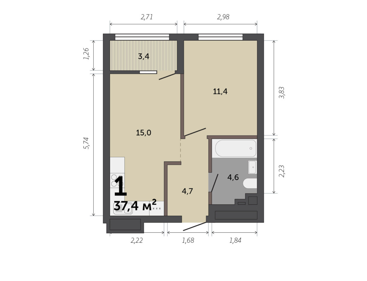 Общая площадь 37.4 м2