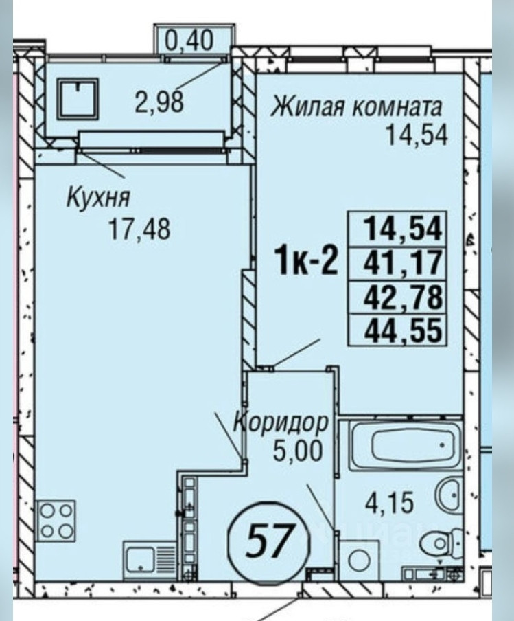 Самая просторная однокомнатная квартира: кухня-гостиная 17.5кв.м+14кв.м спальня с нишей под гардероб. Лоджия остекленная 3кв.м, организовано место для кондиционера. Санузел совмещен, в коридоре ниша под шкаф-купе.