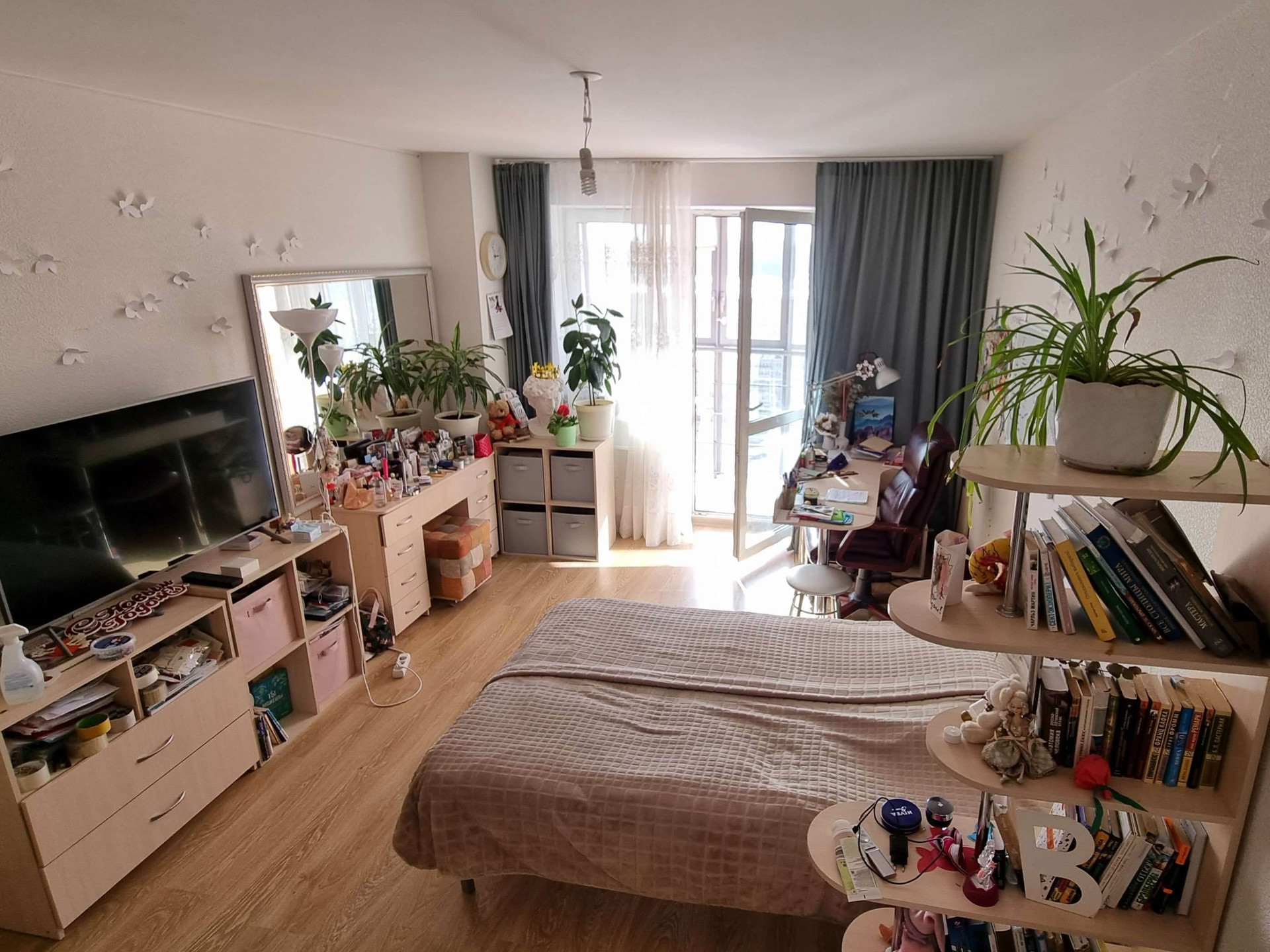 Спальня просторная 18,8 м2 с выходом на лоджию с панорамным остеклением.