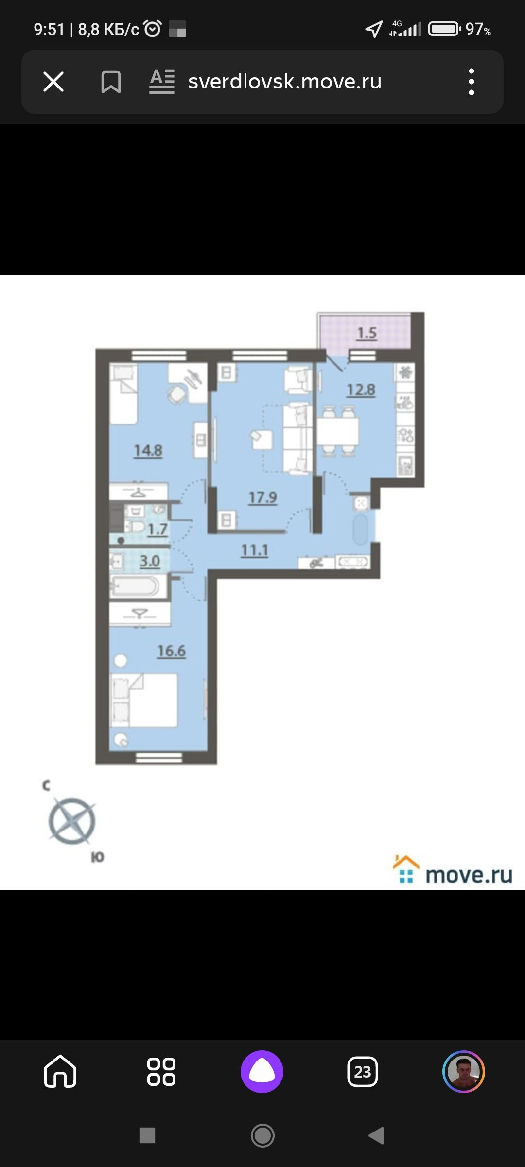 Жилая площадь 46.3 м2