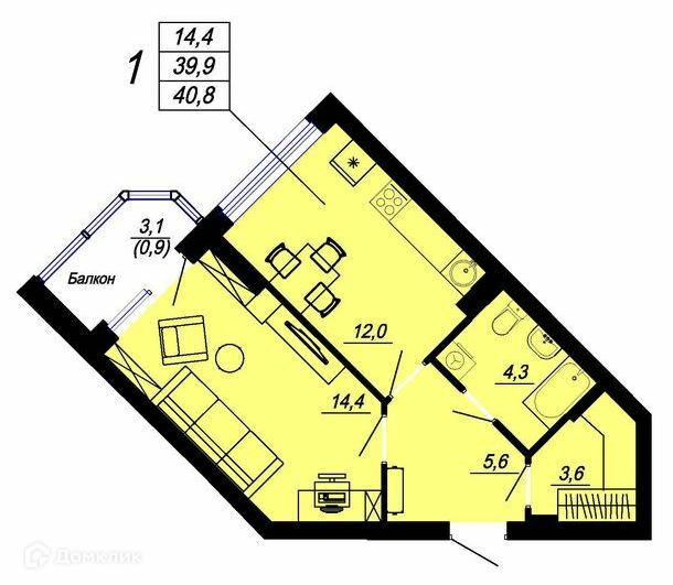 Общая площадь 39.9 м2