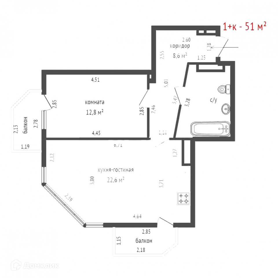 Общая площадь 51 м2