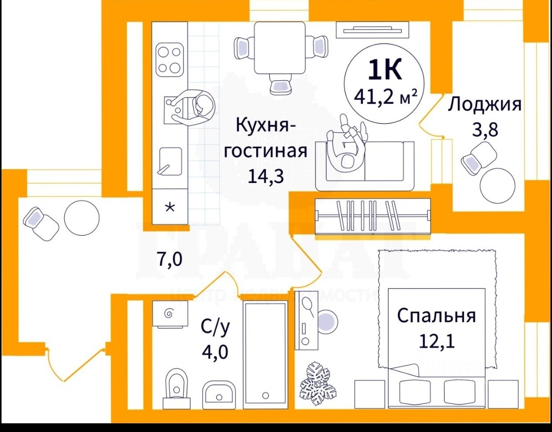 Общая площадь 41.3 м2