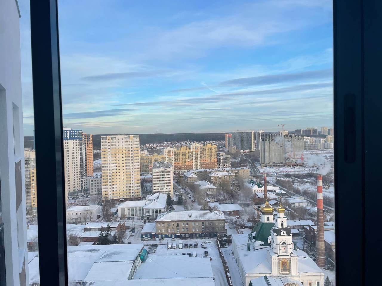 Квартира-студия расположена на последнем 20 этаже в секции на 4 квартиры. Сверху технический этаж. Панорамные окна и панорамное остекление лоджии. Красивый вид на церковь и лесопарковую зону  вдали.