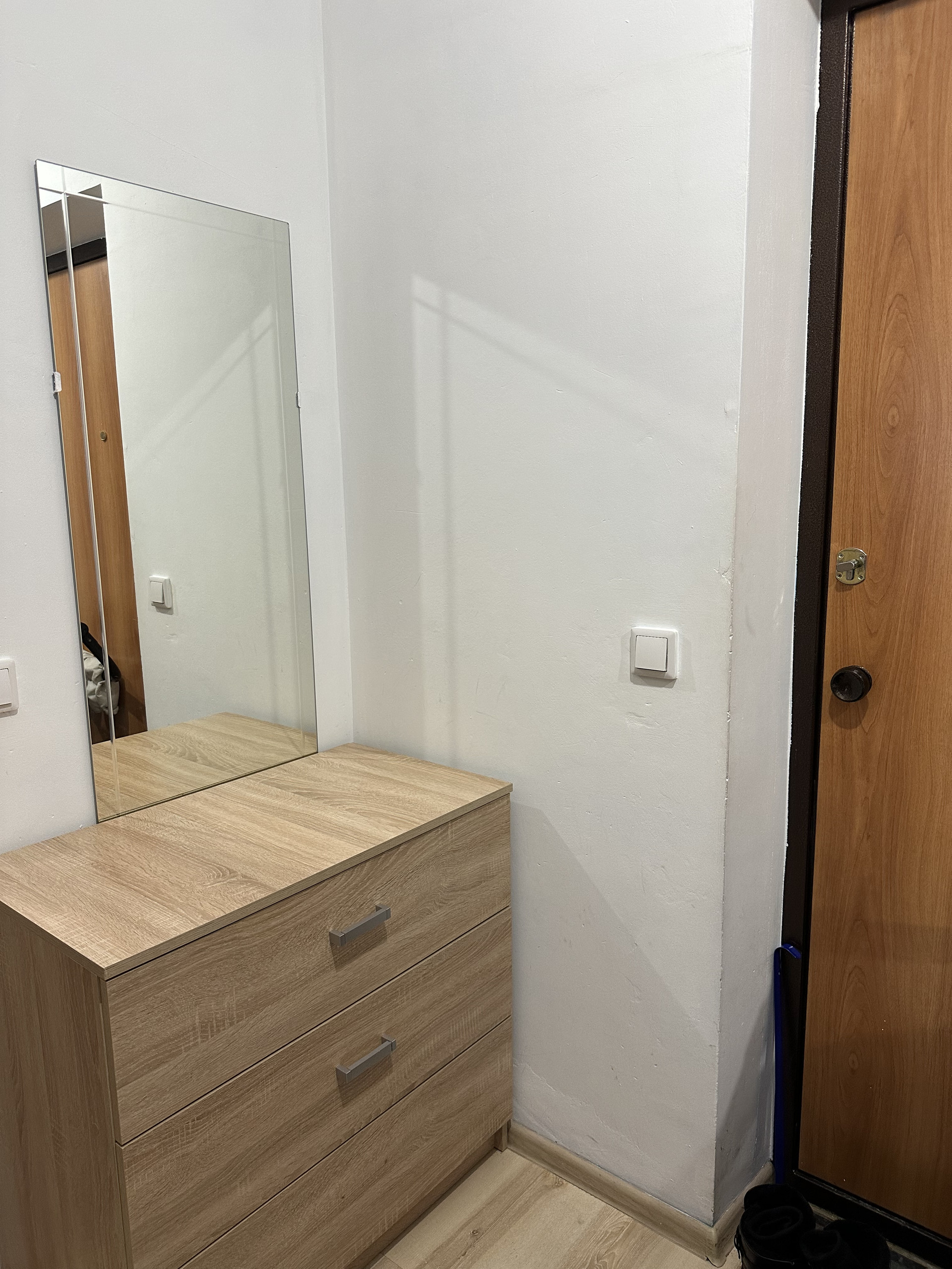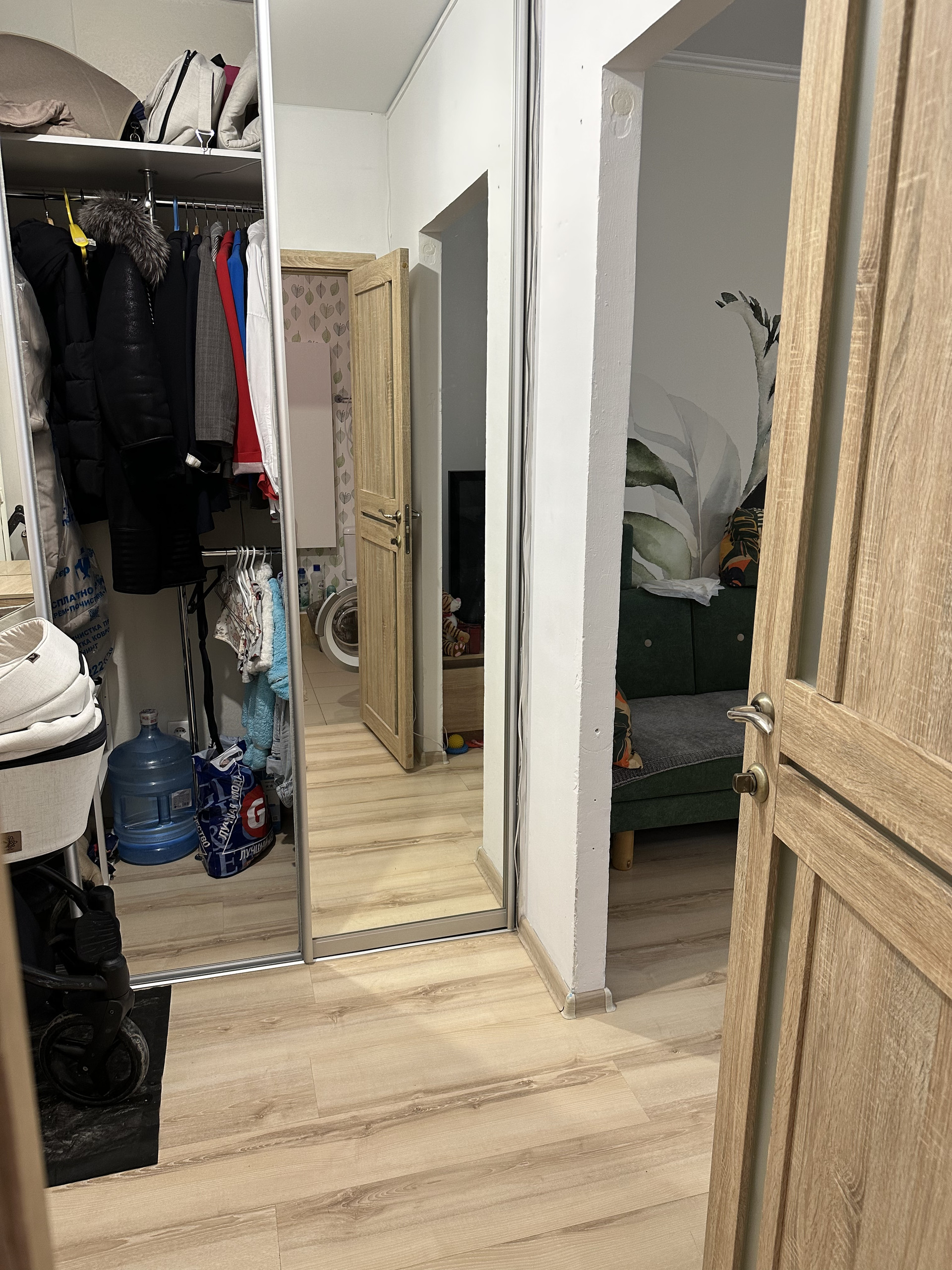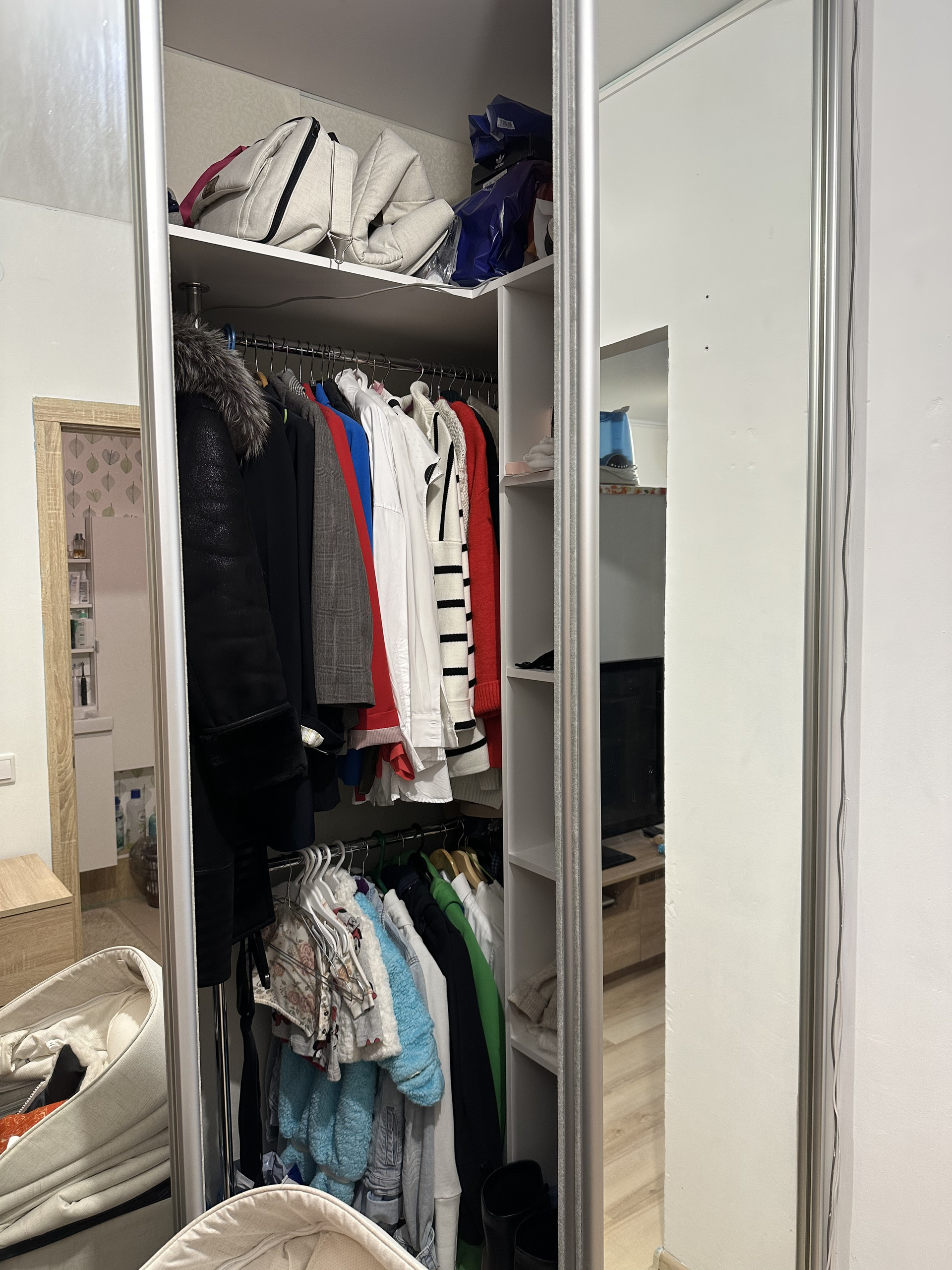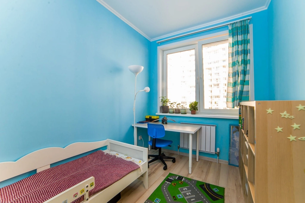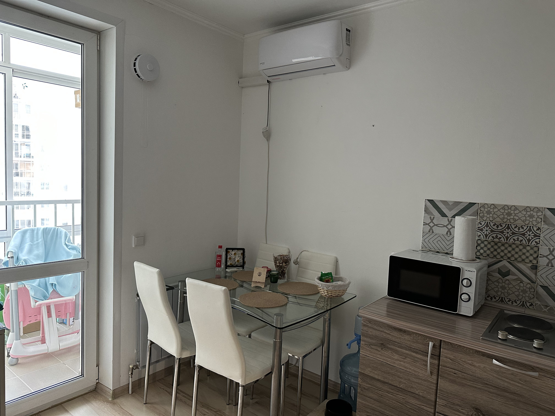 Квартира-студия. Сделана небольшая перепланировка - выделена комната (была детской, сейчас спальня - см фото). Большая ванная комната, удобные обеденная зона и зона отдыха, в коридоре вместительный гардероб, на балконе угловой шкаф для мелочей и сушилка. Кондиционер новый, установлен летом.