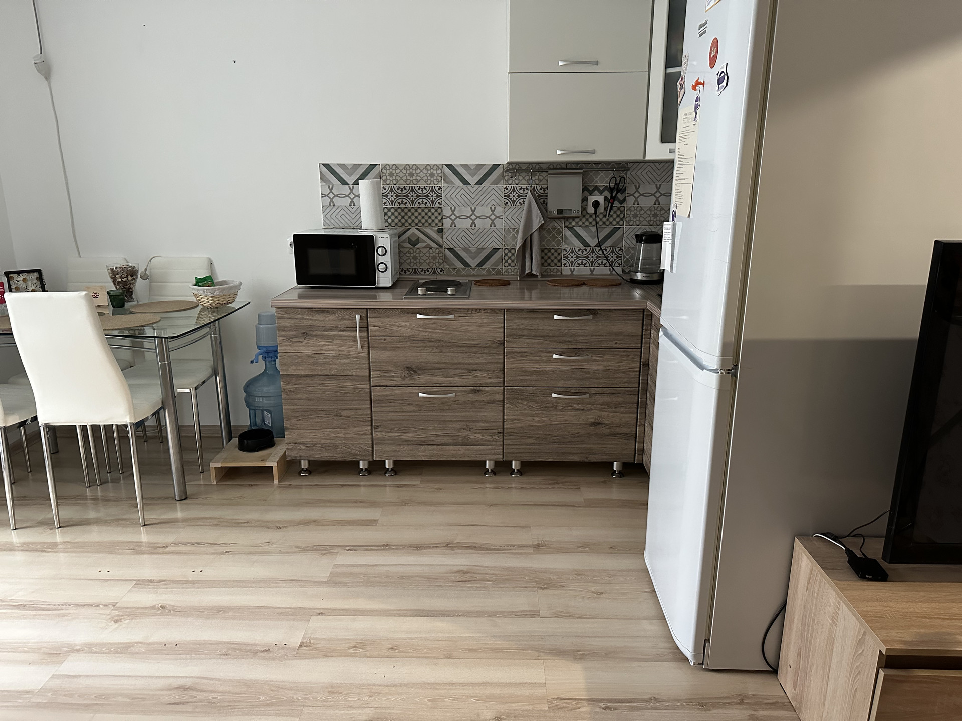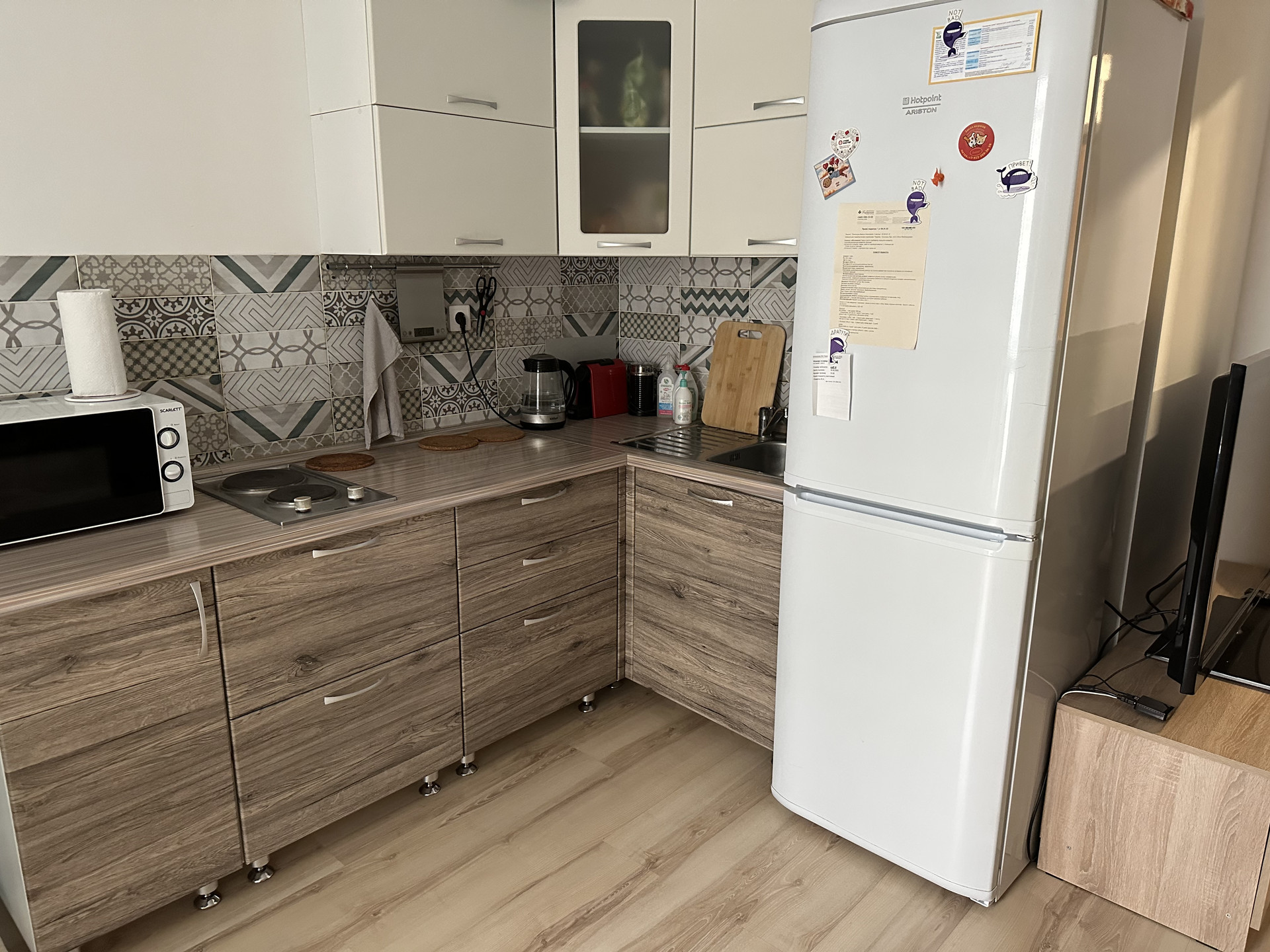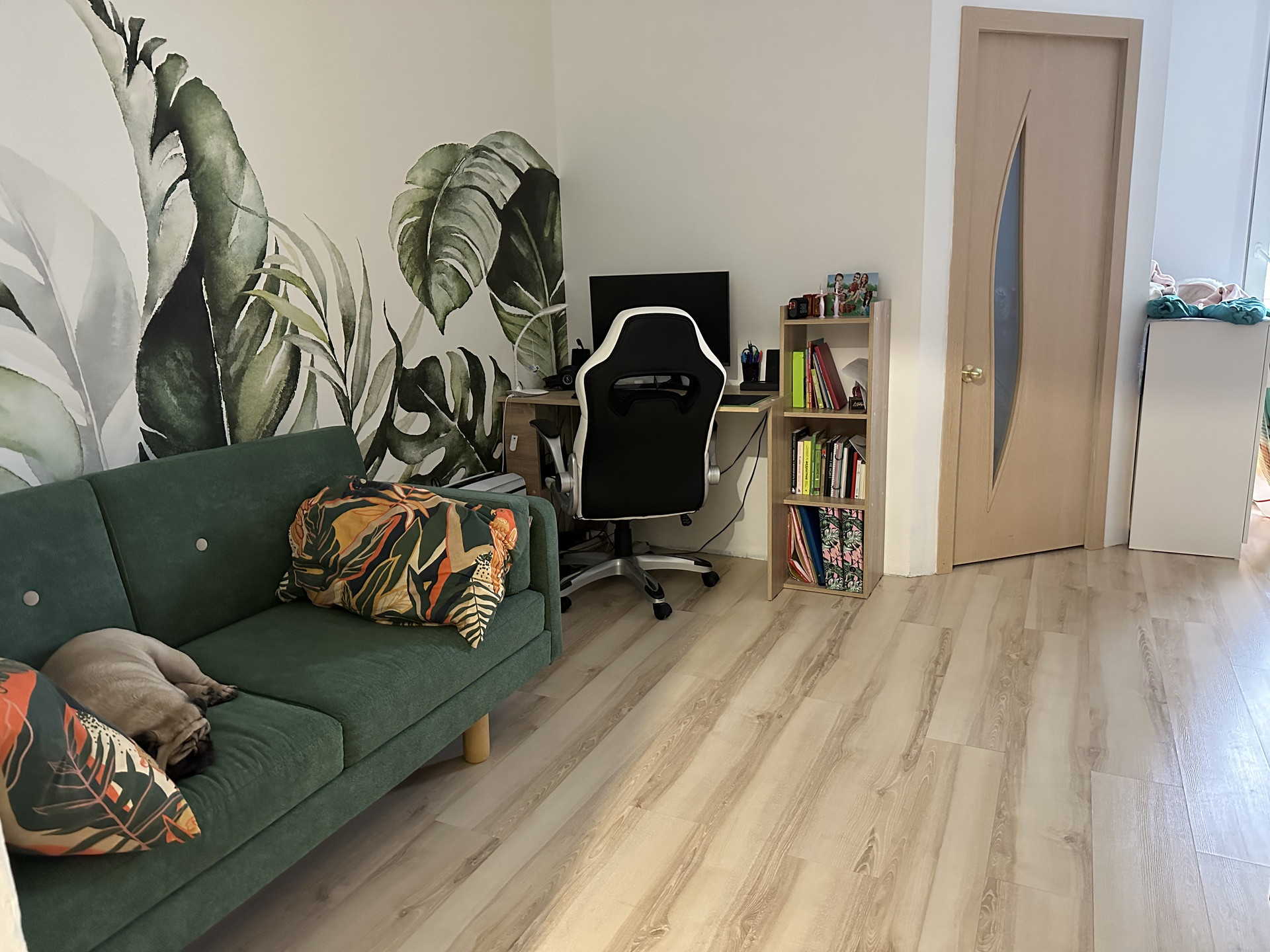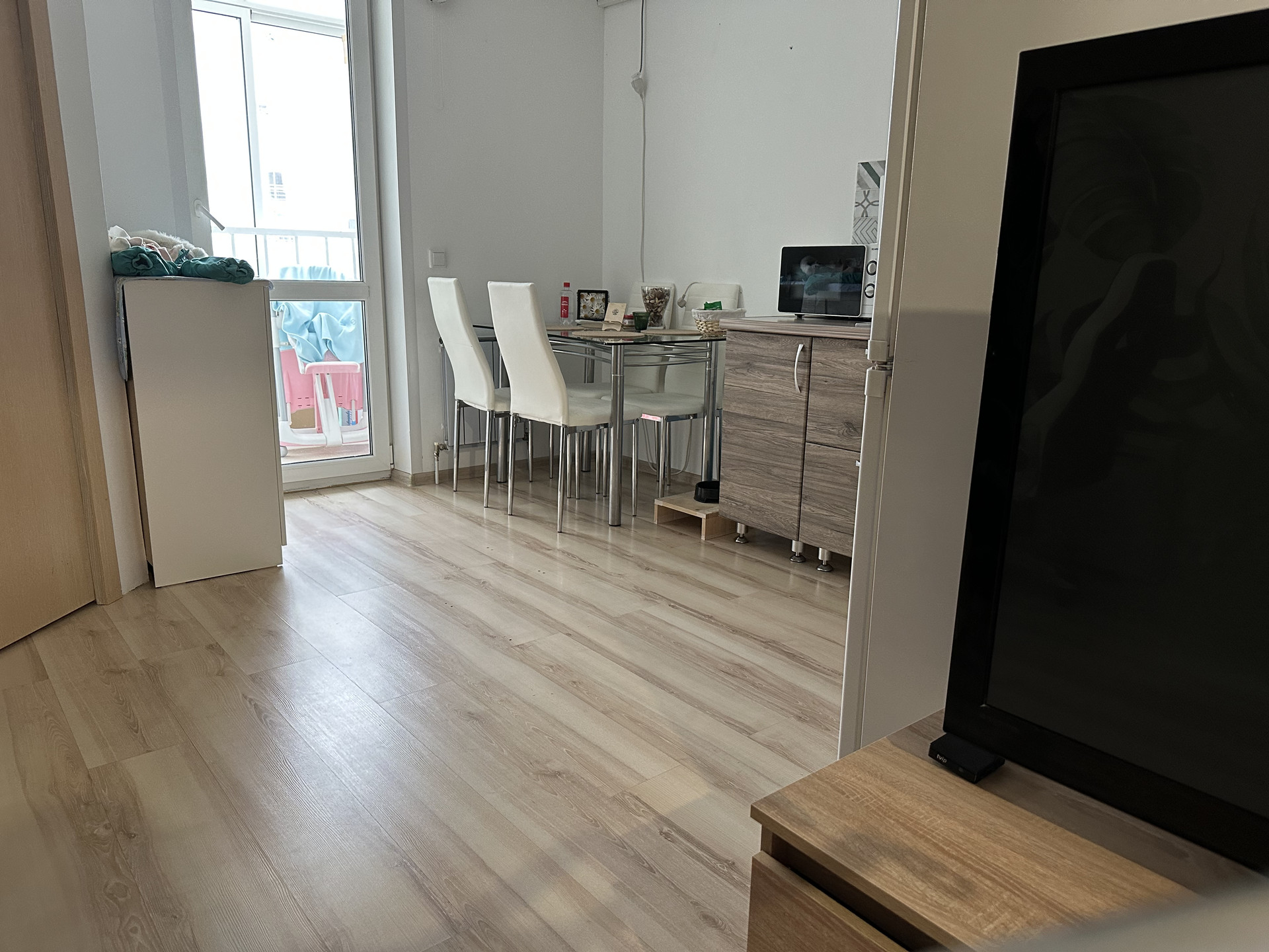 Квартира-студия. Сделана небольшая перепланировка - выделена комната (была детской, сейчас спальня - см фото). Большая ванная комната, удобные обеденная зона и зона отдыха, в коридоре вместительный гардероб, на балконе угловой шкаф для мелочей и сушилка. Кондиционер новый, установлен летом.