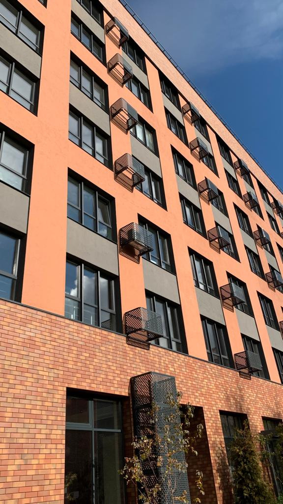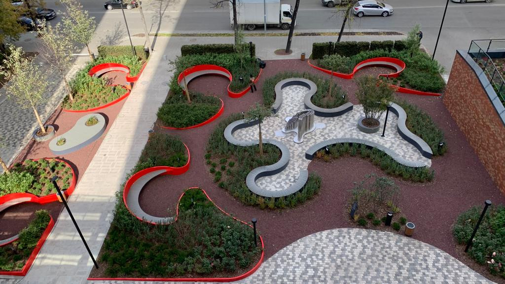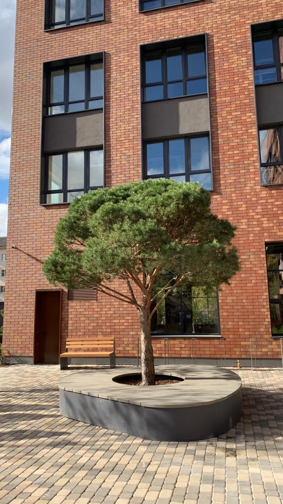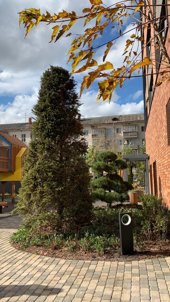 Ландшафтный дизайн внутреннего двора выполнен в стиле английского сада. Это классические живые изгороди в сочетании с живописными композициями из кустарников и цветов. Расположен выше уровня земли. Детское игровое оборудование и уличная мебель изготовлены по индивидуальным эскизам из дерева и металла. Внутренний двор предназначен для жителей и их гостей. Во дворе, в паркинге, в вестибюле и в секциях дома установлено видеонаблюдение. Есть система контроля доступа на входах и на въезде в паркинг. Территория дома круглосуточно охраняется.