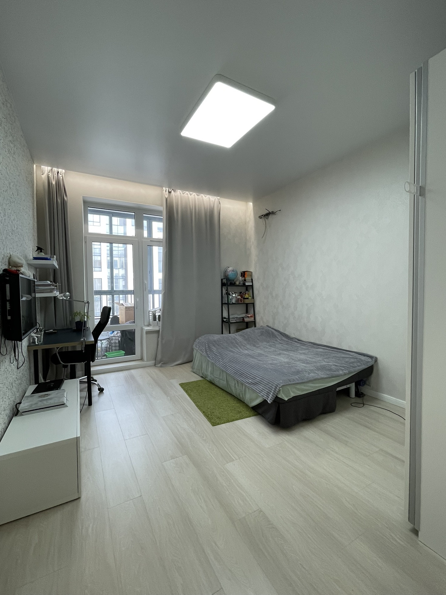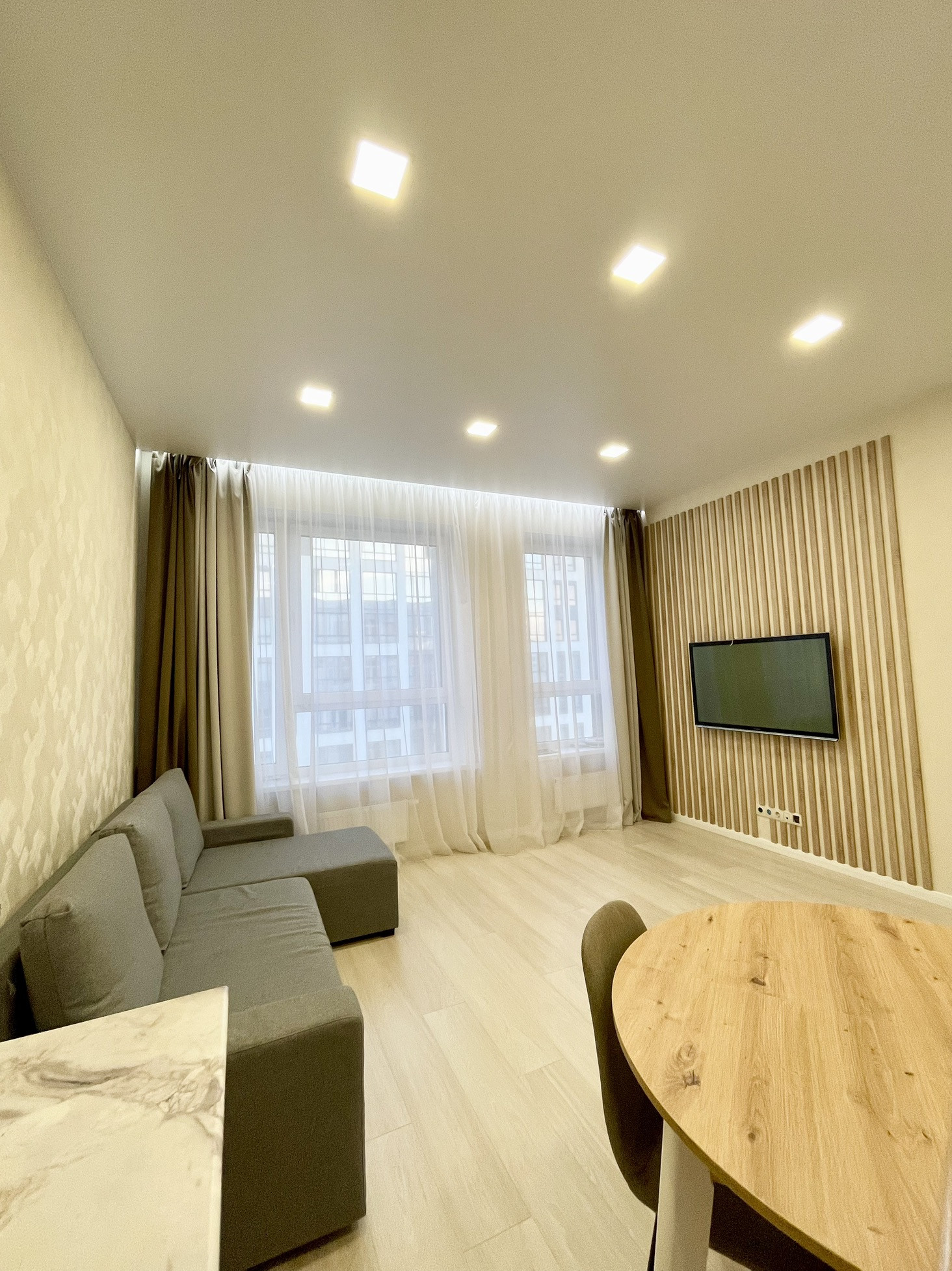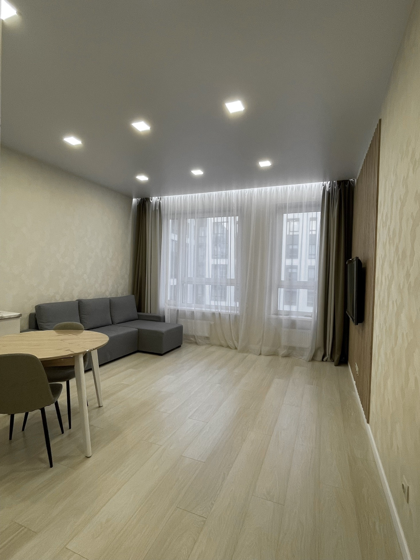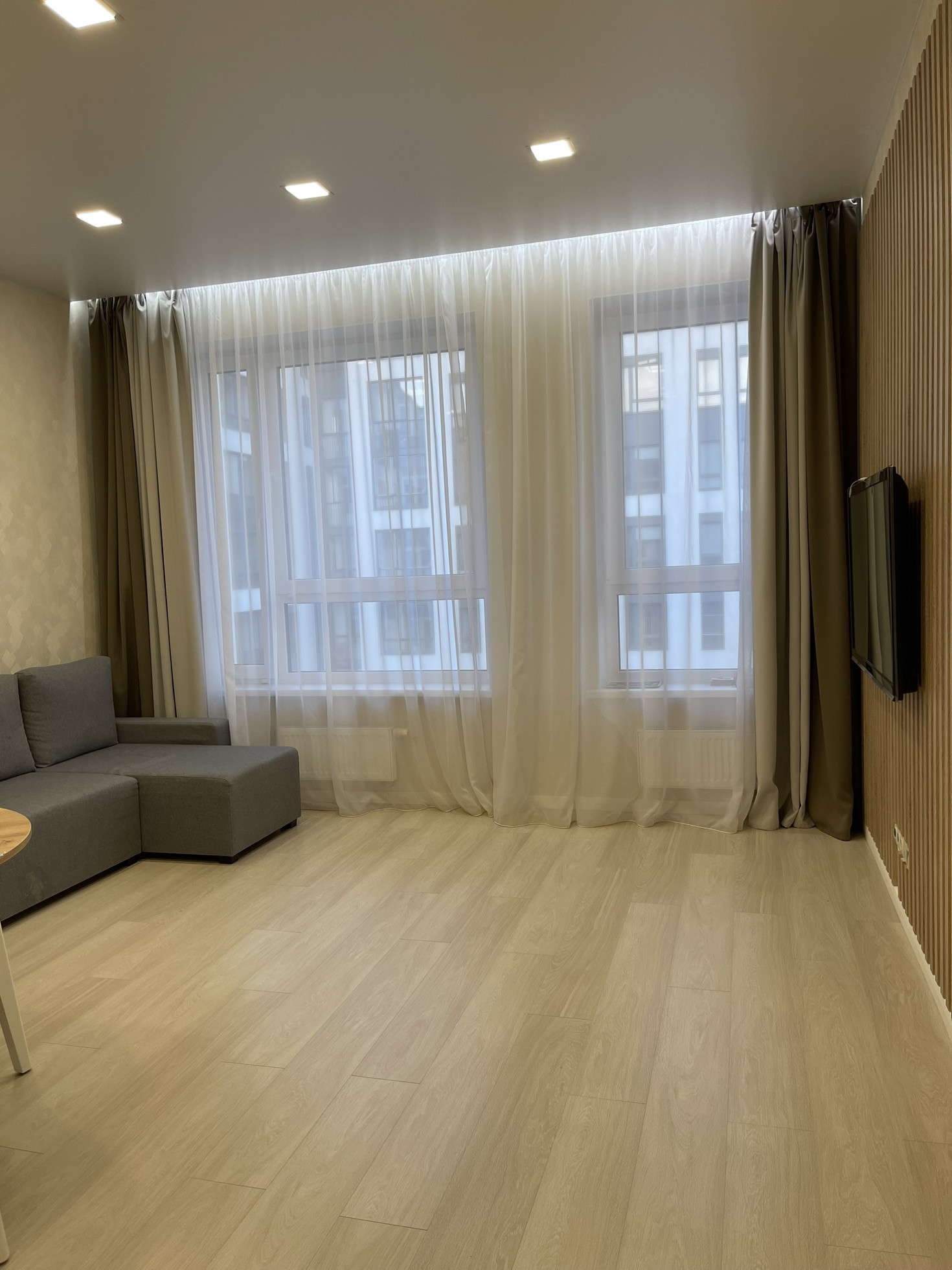 Окна квартиры ориентированы во двор. В квартире выделены 2 комнаты, 2 сан.узла ( душ и ванная), просторная гостиная. В квартире сделан ремонт. Высокие потолки 3 метра.