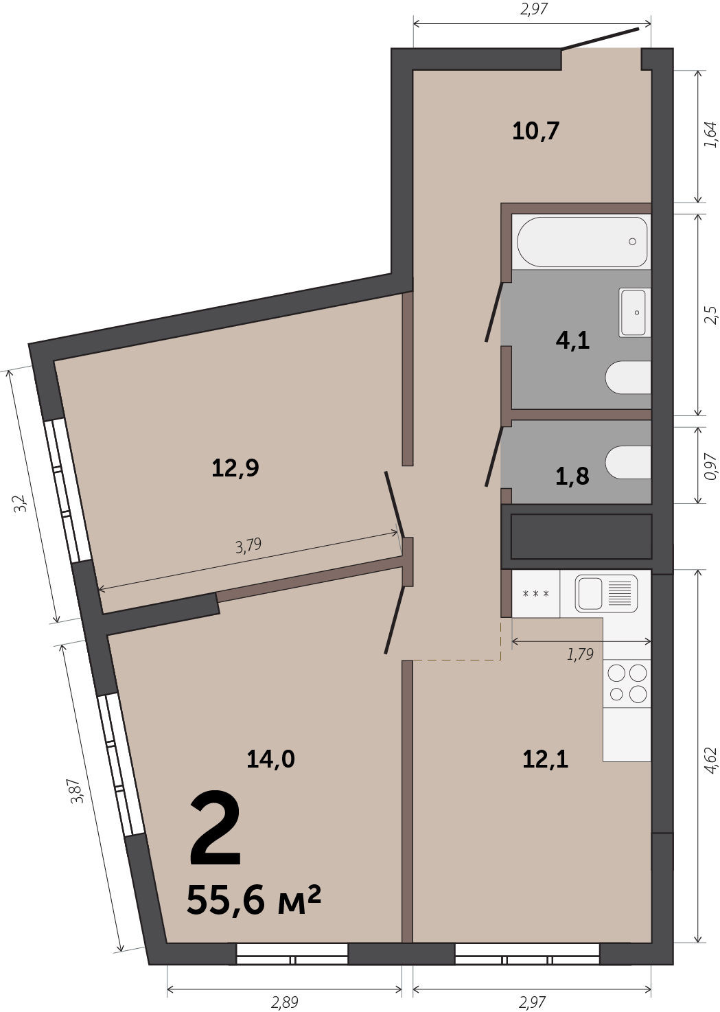 Общая площадь 55.6 м2