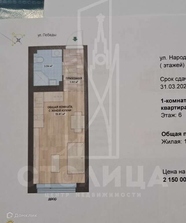 Квартира студия, 22.4 м2, этаж 6 / 8, на продажу в Екатеринбурге, улица Победы