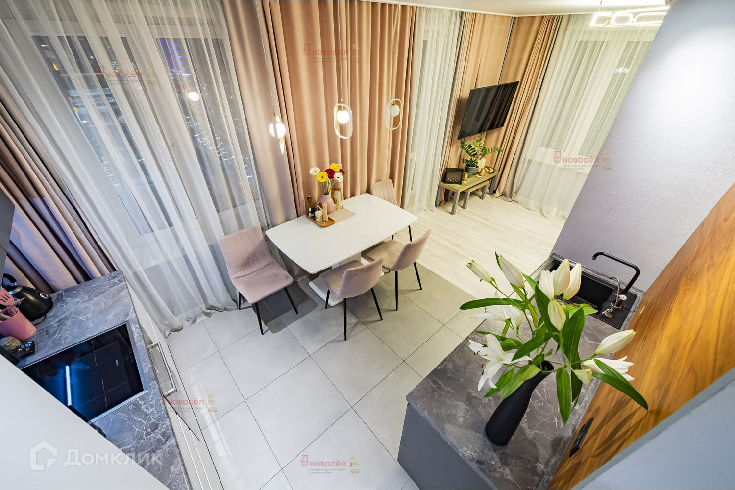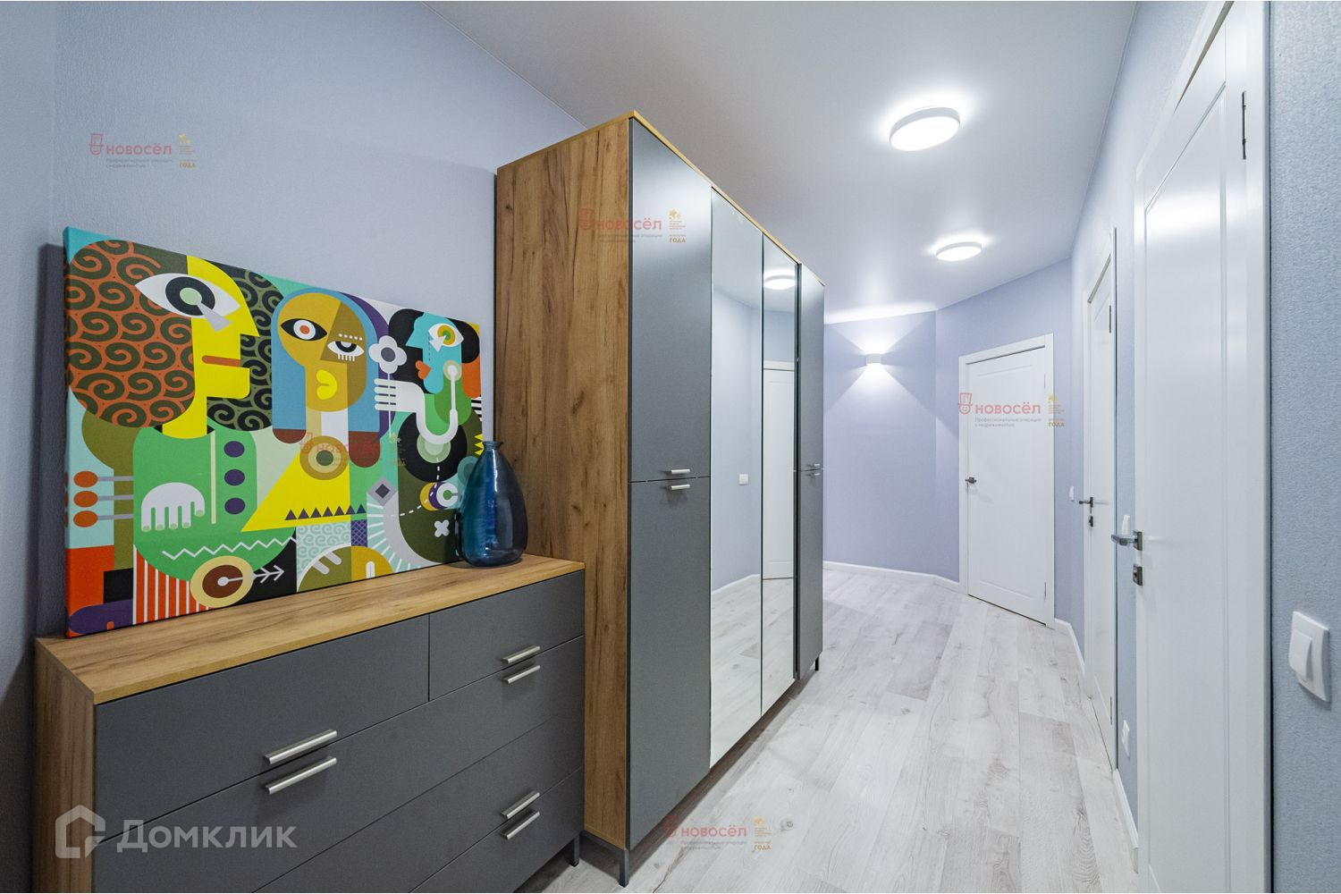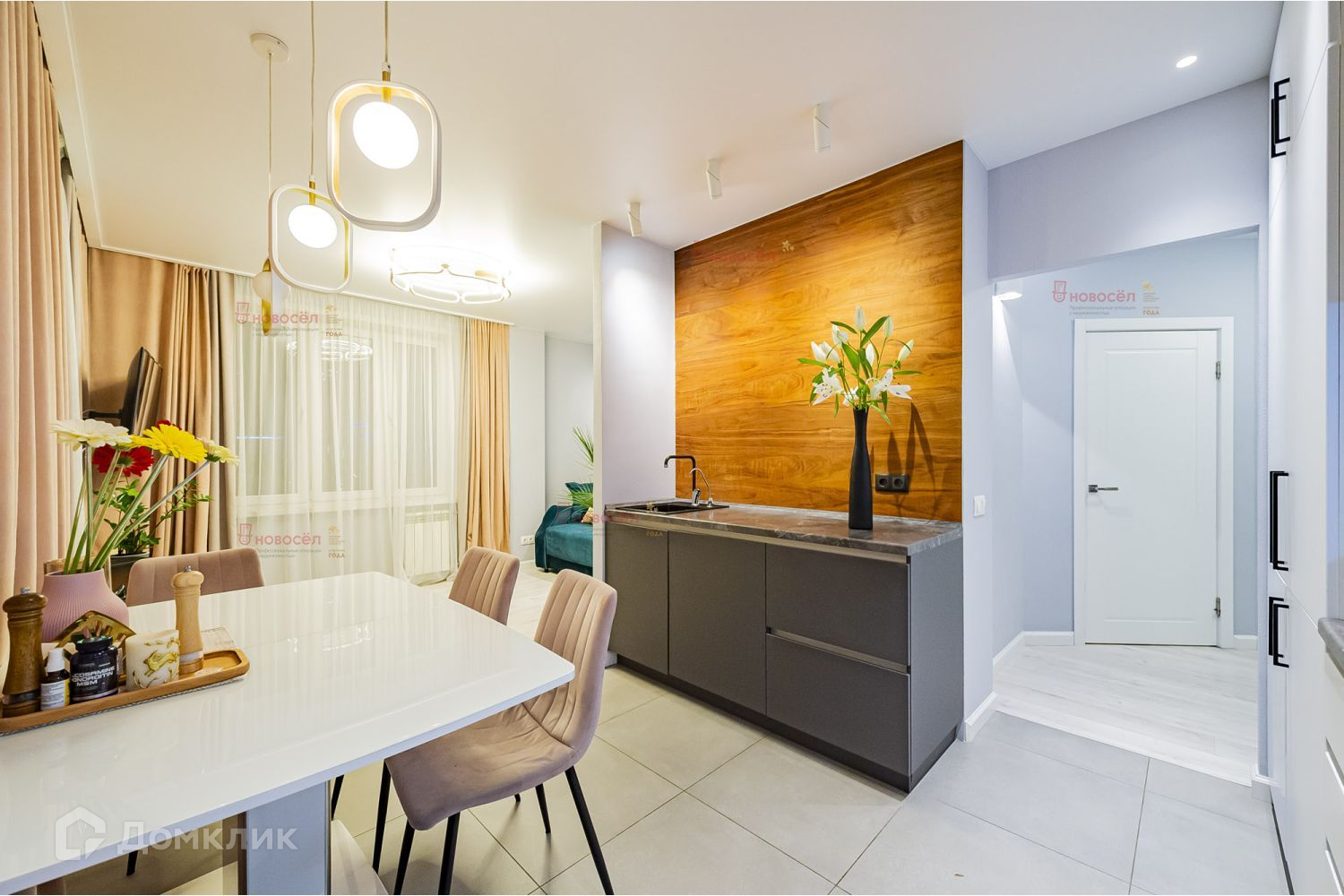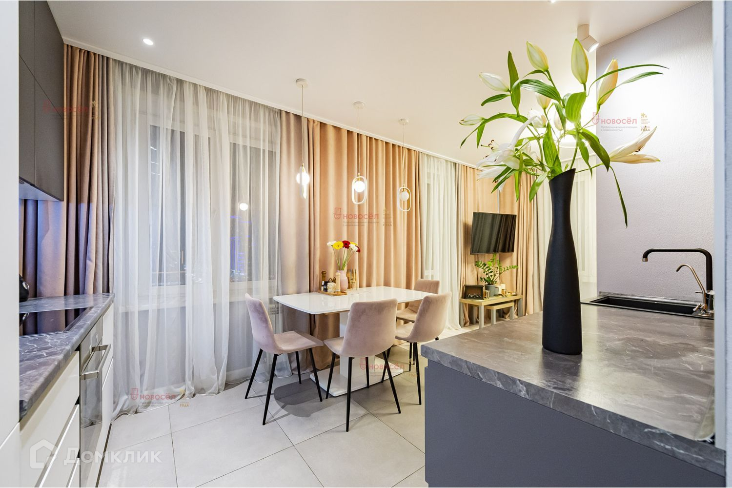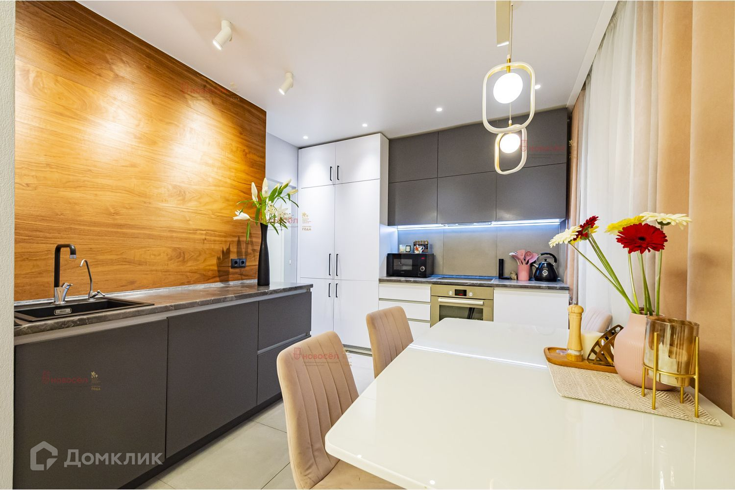 В квартире остается встроенная мебель, кухонный гарнитур, гардеробная и прихожая, шкафы, по договоренности вся необходимая бытовая техника (холодильник, бойлер, варочная поверхность, духовой шкаф, посудомоечная и стиральная машины). Внедрены элементы умного дома.
