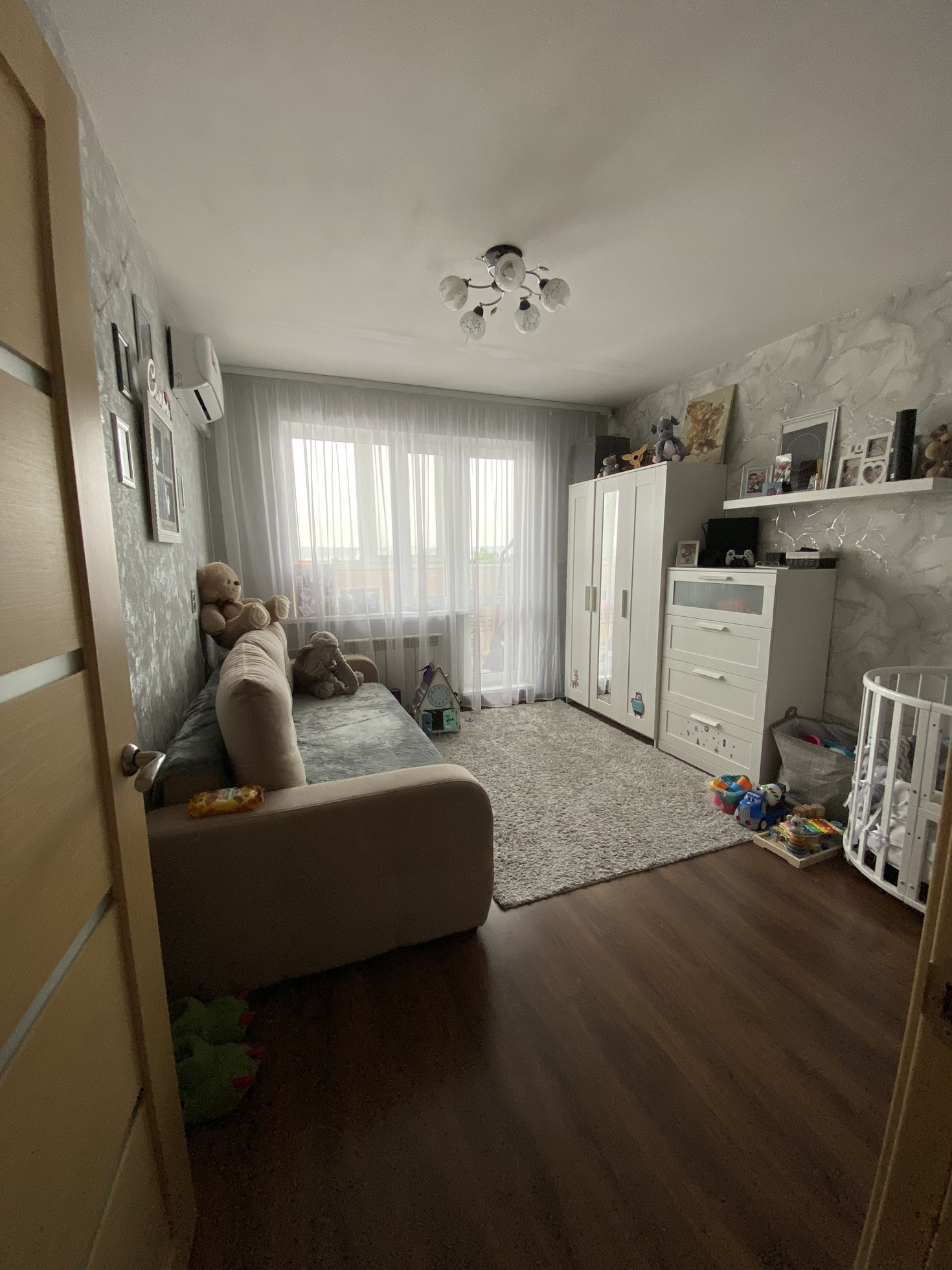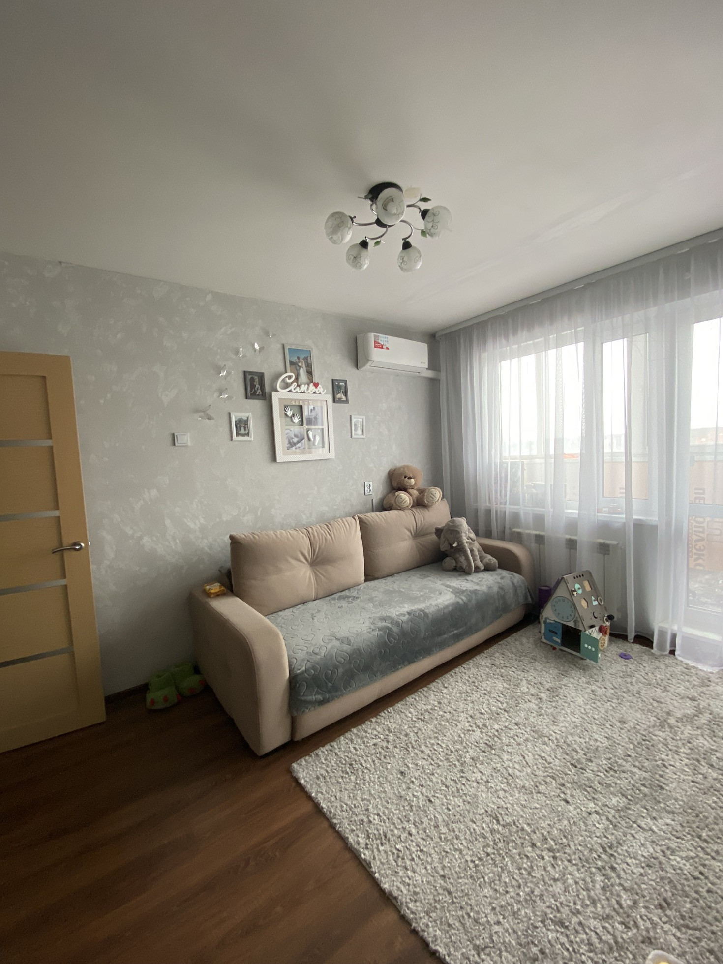 В квартире установлен кондиционер, лоджия утепленная и большая ( можно обшить и сделать еще одно помещение).