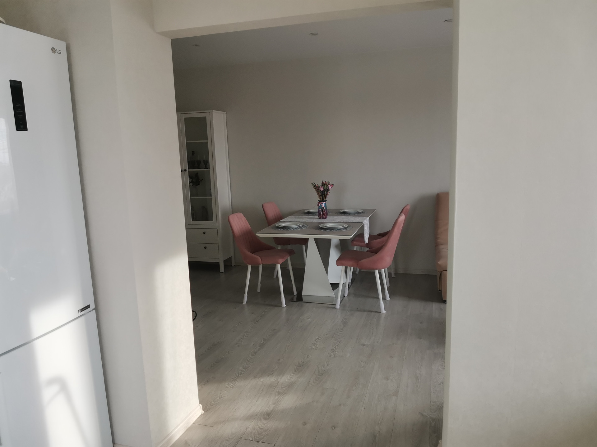 В гостиной: обеденная группа с 4-мя стульями, шкаф-купе с зеркальными дверями, пуф,