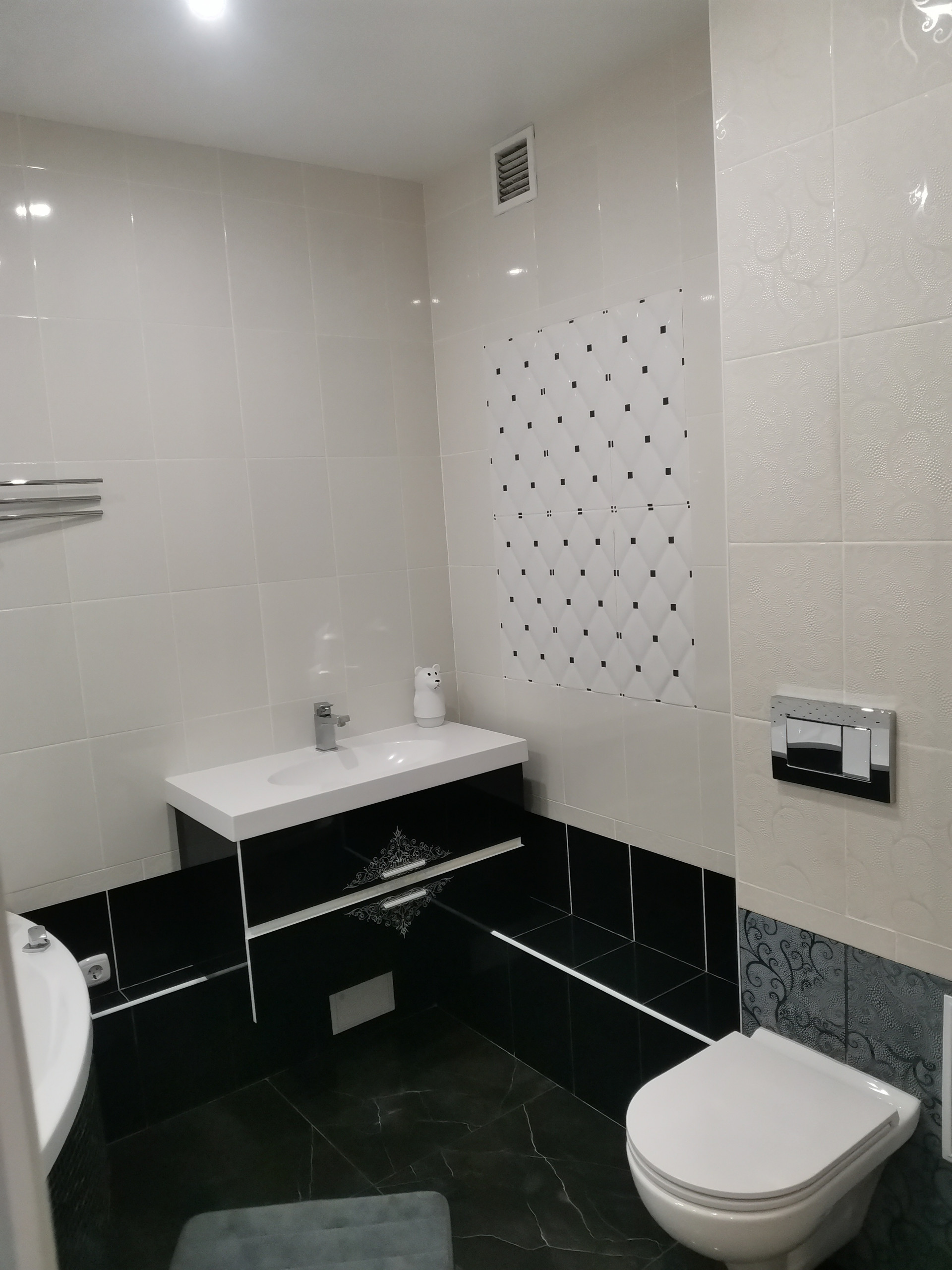 В ванной комнате: ванна, тумба под раковину с раковиной.