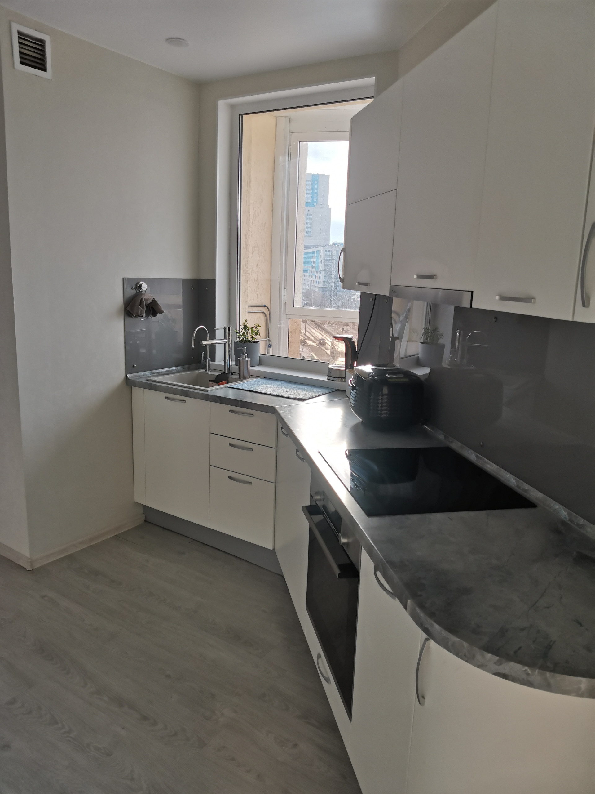 В подарок Покупателю на кухне оставляем эргономичный кухонный гарнитур, духовой