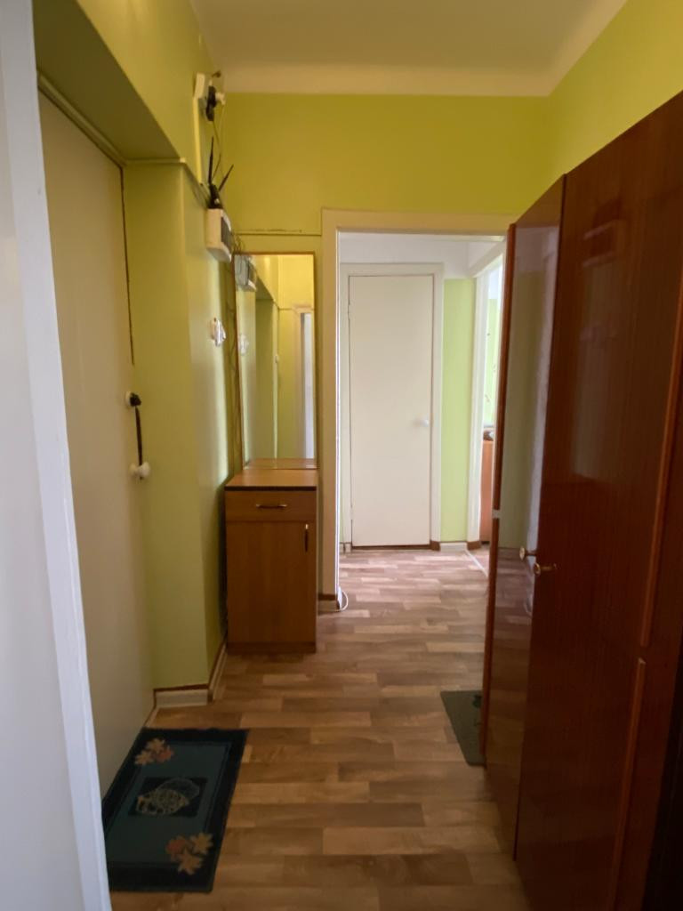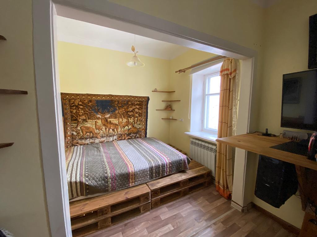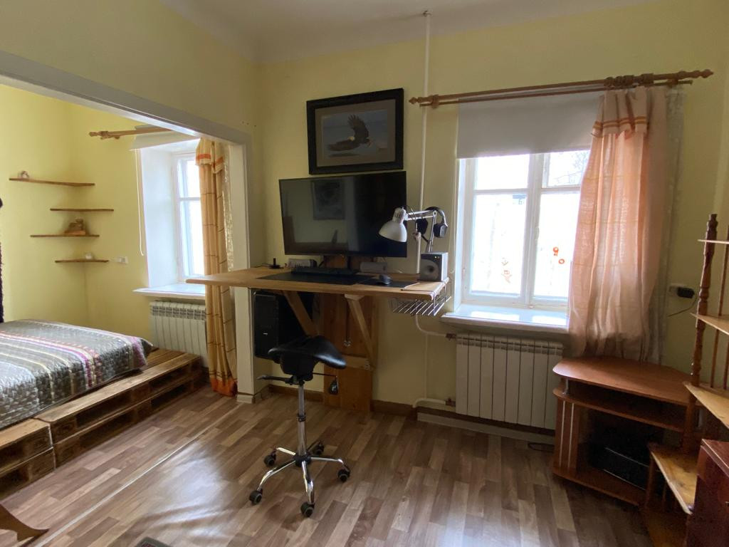 Теплая с удобной планировкой, зонированием спальной зоны и организацией рабочего пространства. Пол ленолиум, стены покраска.