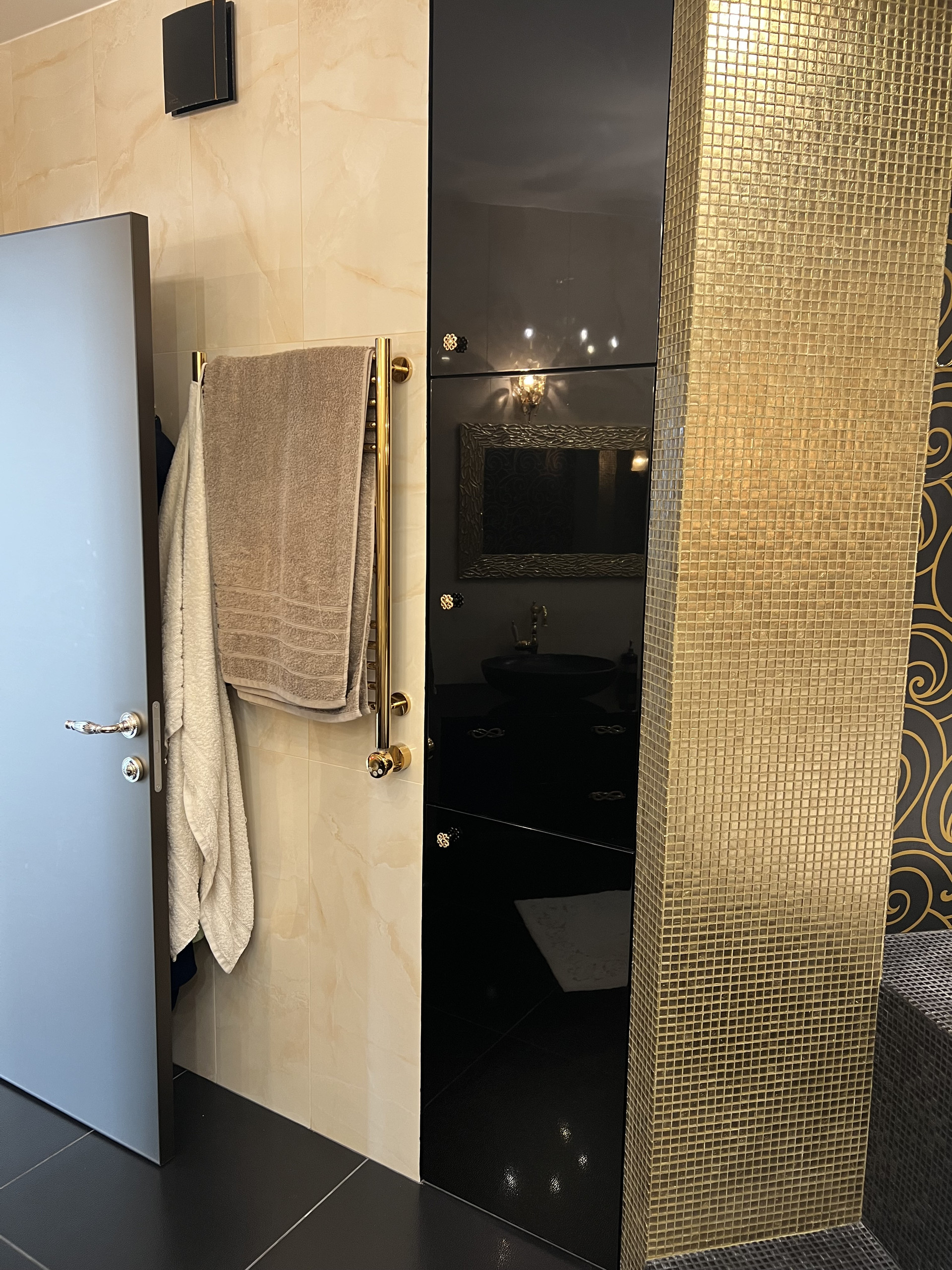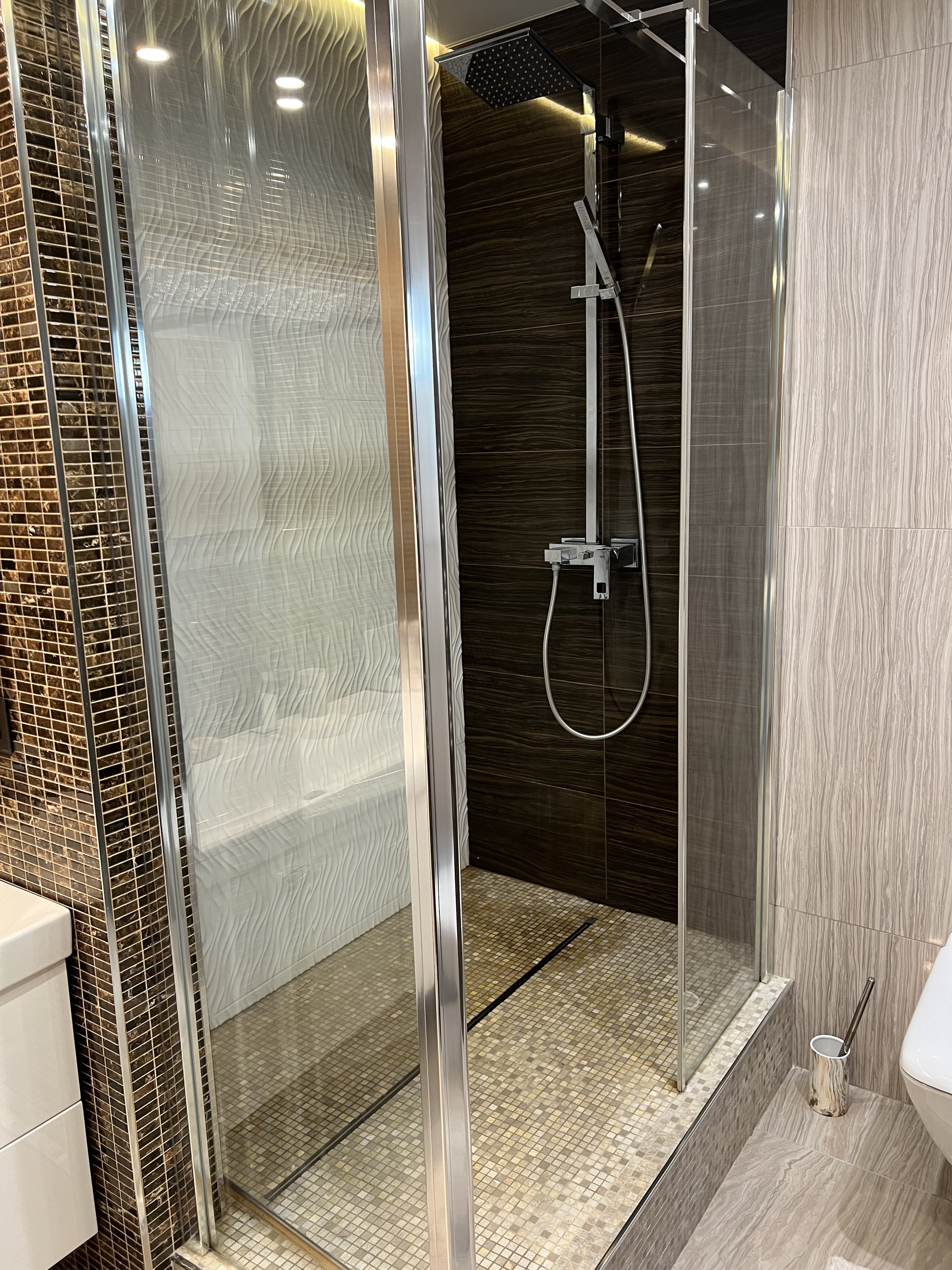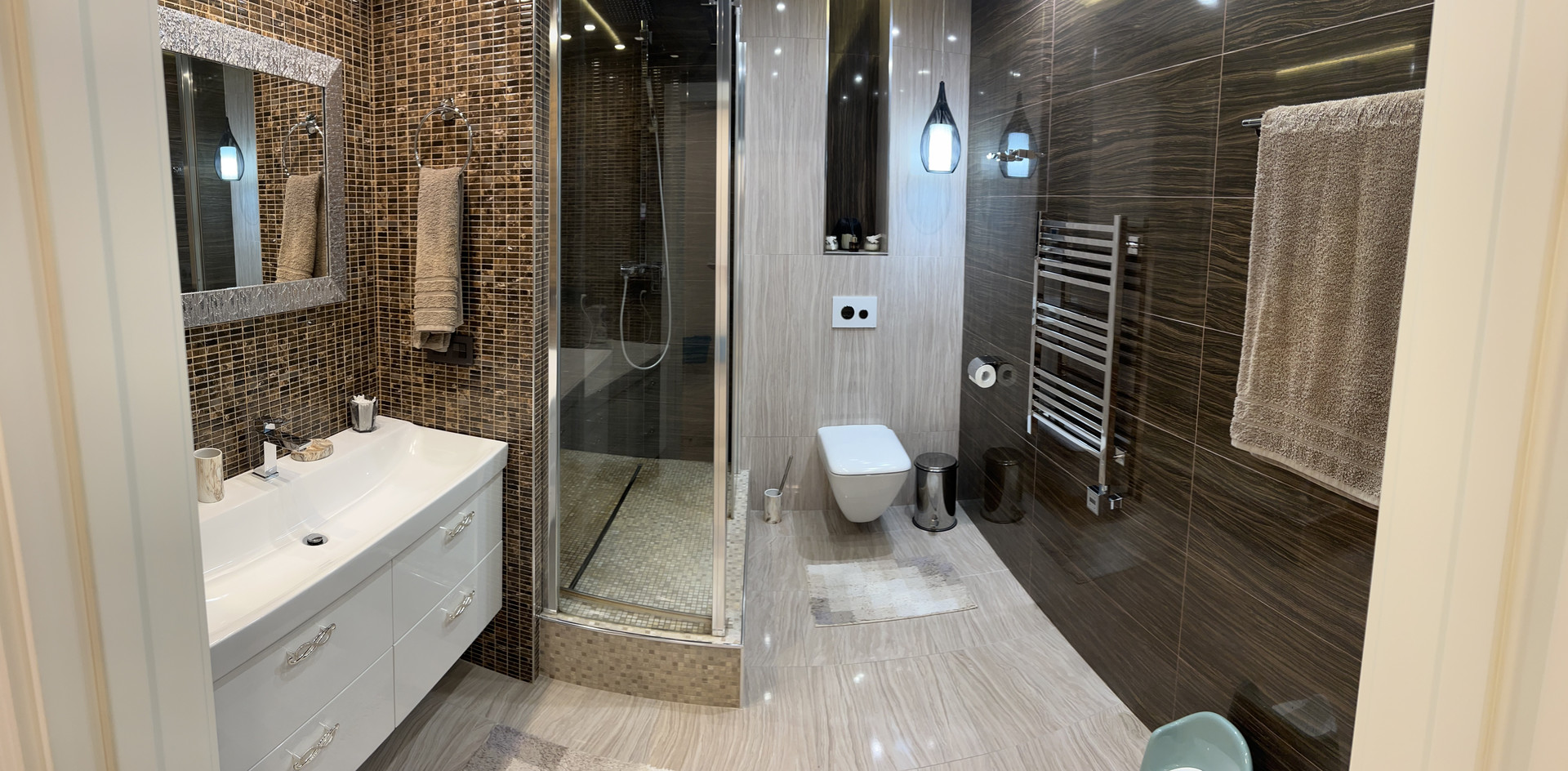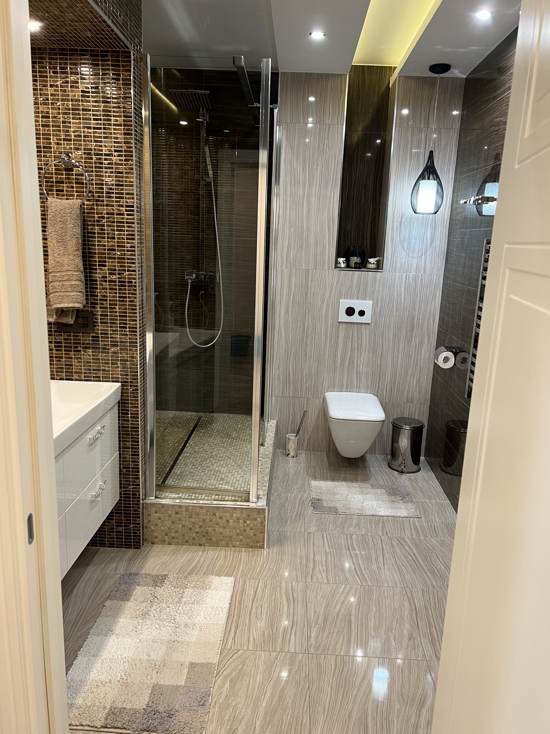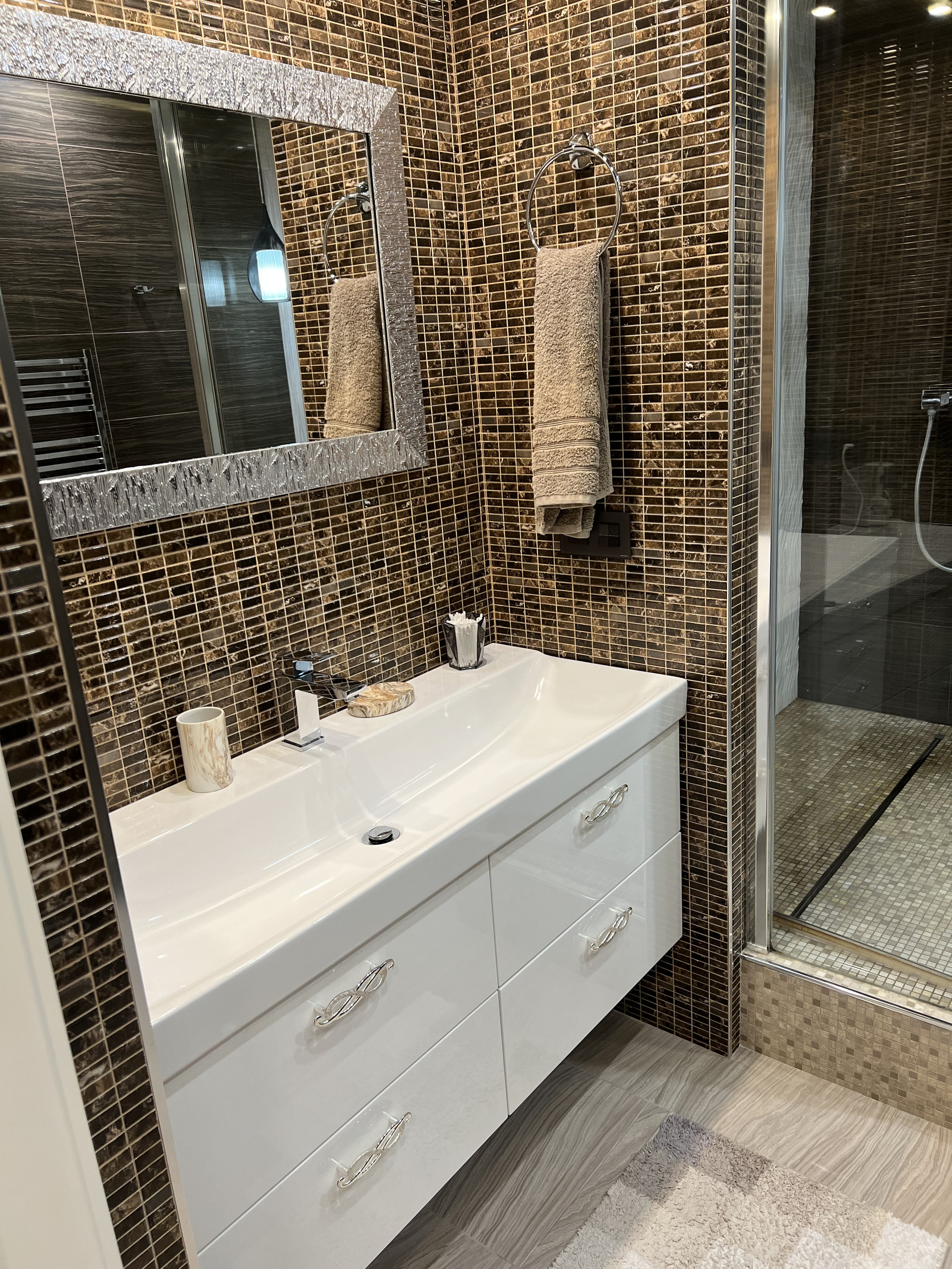 Справа первый сан узел , с душевой кабиной. Подогрев пола , плитка заказана в магазине Бомонд ( Испания) , душевая кабина ( Германия) сантехника в первом санузле фирма Laufen , тумба сделана на заказ по индивидуальным размерам, фурнитура Италия.