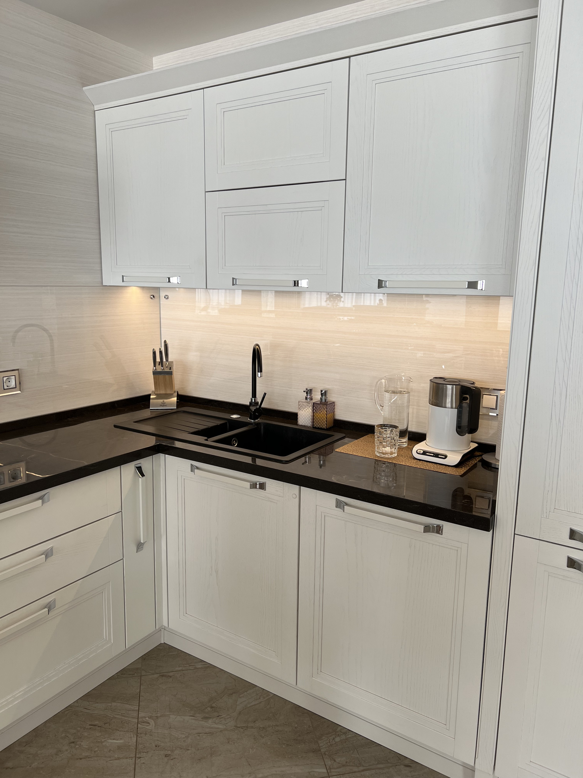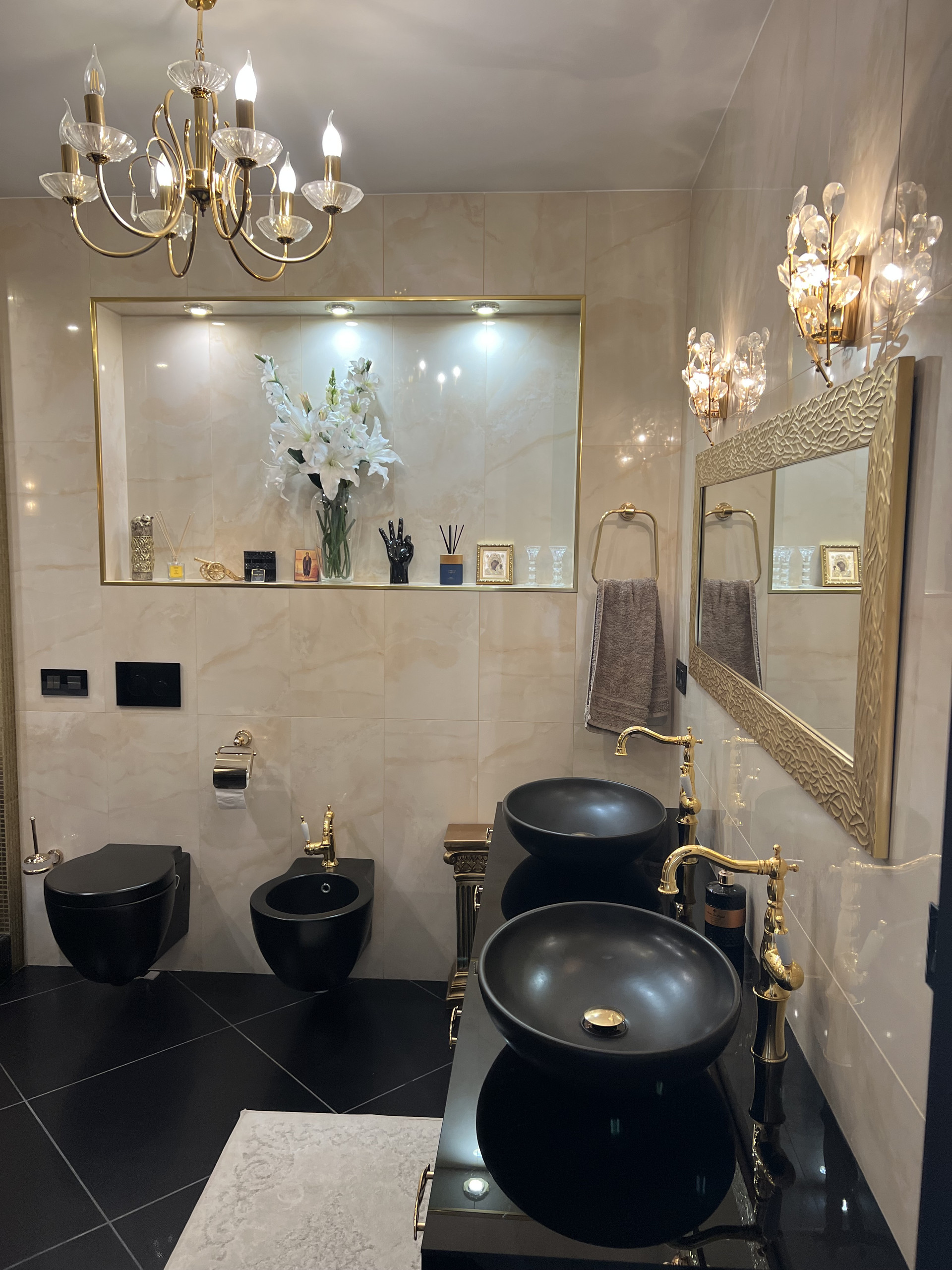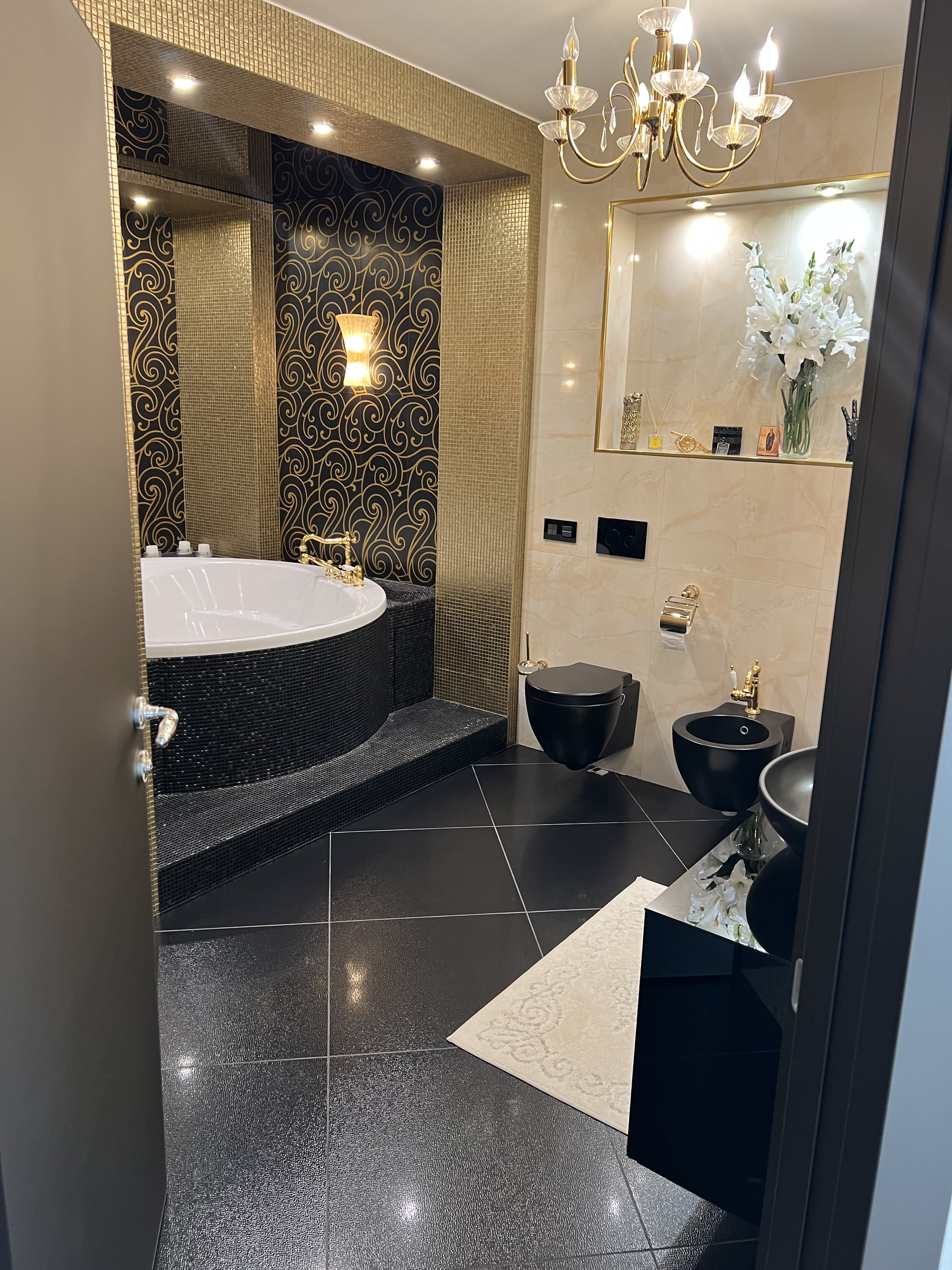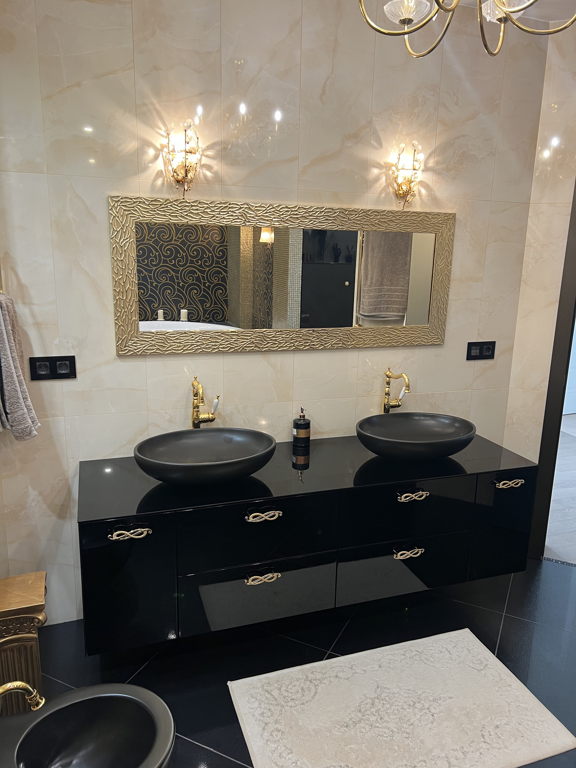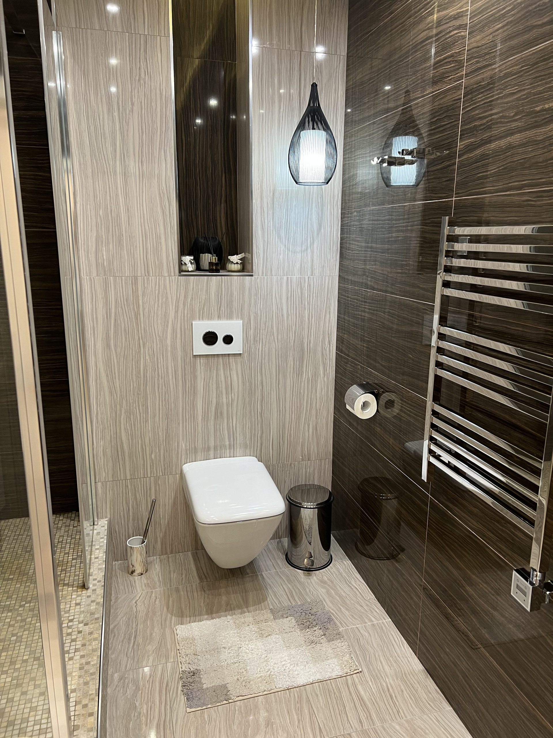 Справа первый сан узел , с душевой кабиной. Подогрев пола , плитка заказана в магазине Бомонд ( Испания) , душевая кабина ( Германия) сантехника в первом санузле фирма Laufen , тумба сделана на заказ по индивидуальным размерам, фурнитура Италия.